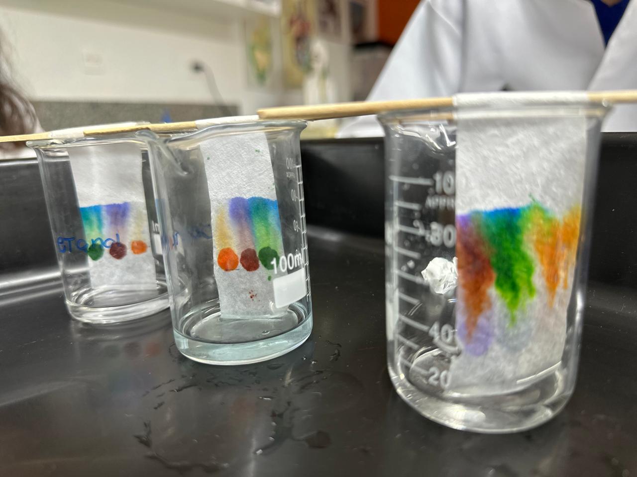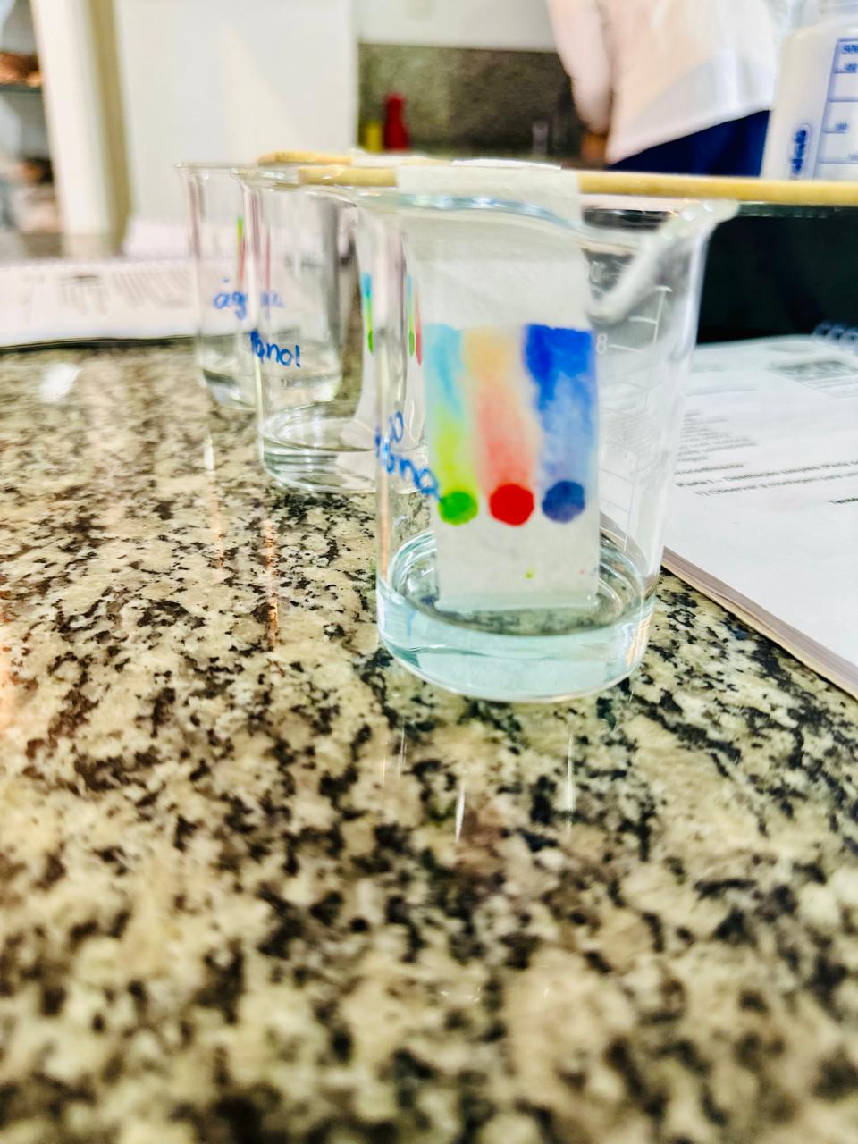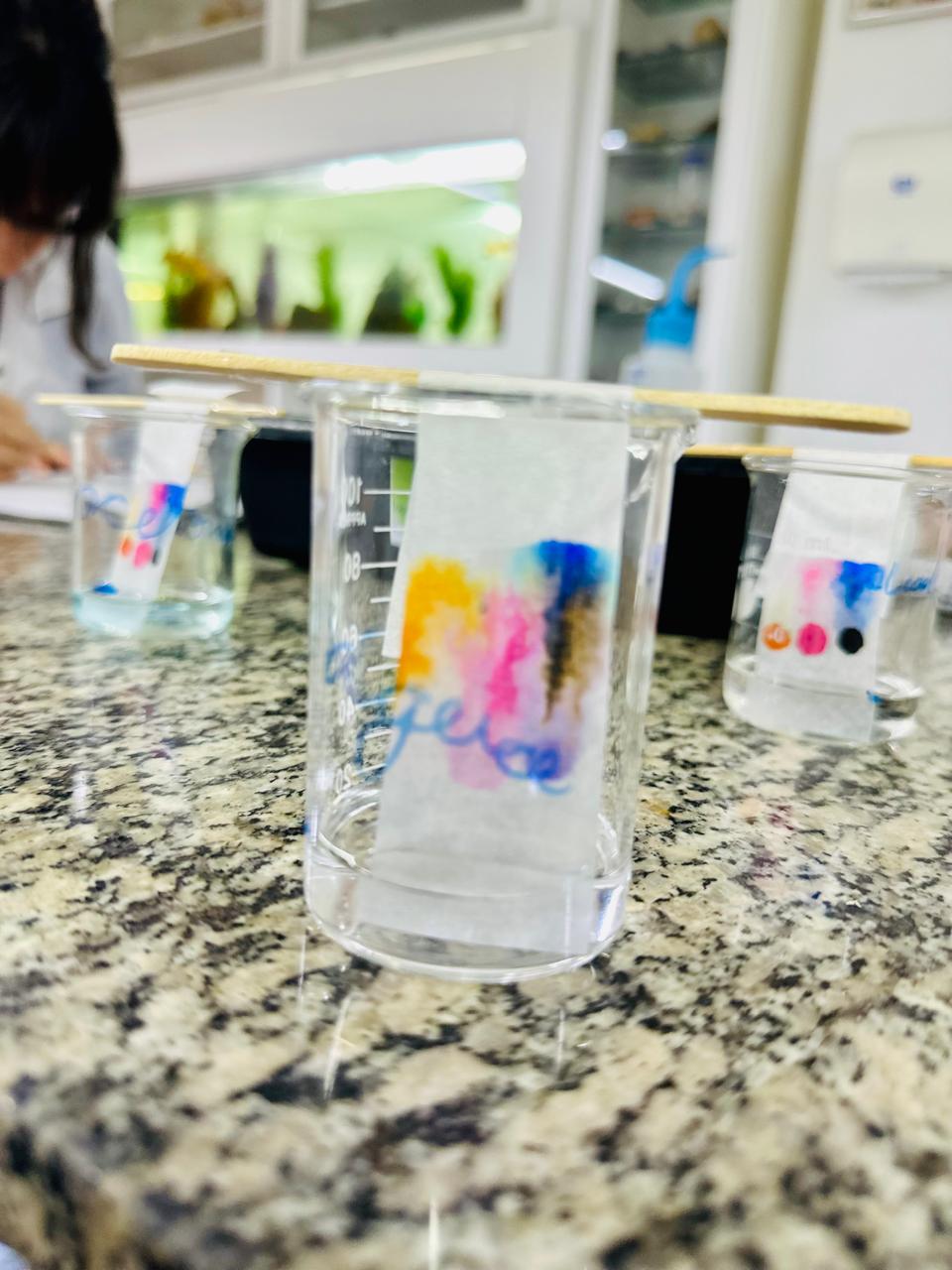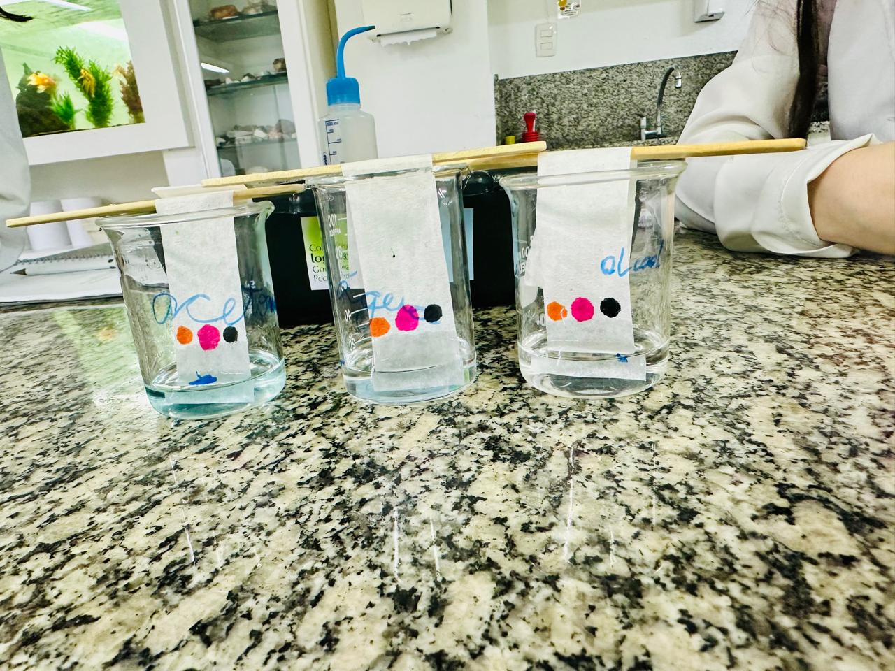 Na primeira etapa da atividade, observaram o funcionamento da destilação simples e compreenderam como essa técnica permite separar componentes de uma mistura com base na diferença de seus pontos de ebulição. Em seguida, aplicaram o processo de cromatografia para identificar os diferentes pigmentos presentes em canetas hidrocor, utilizando como fase móvel três solventes distintos: água, etanol e acetona.