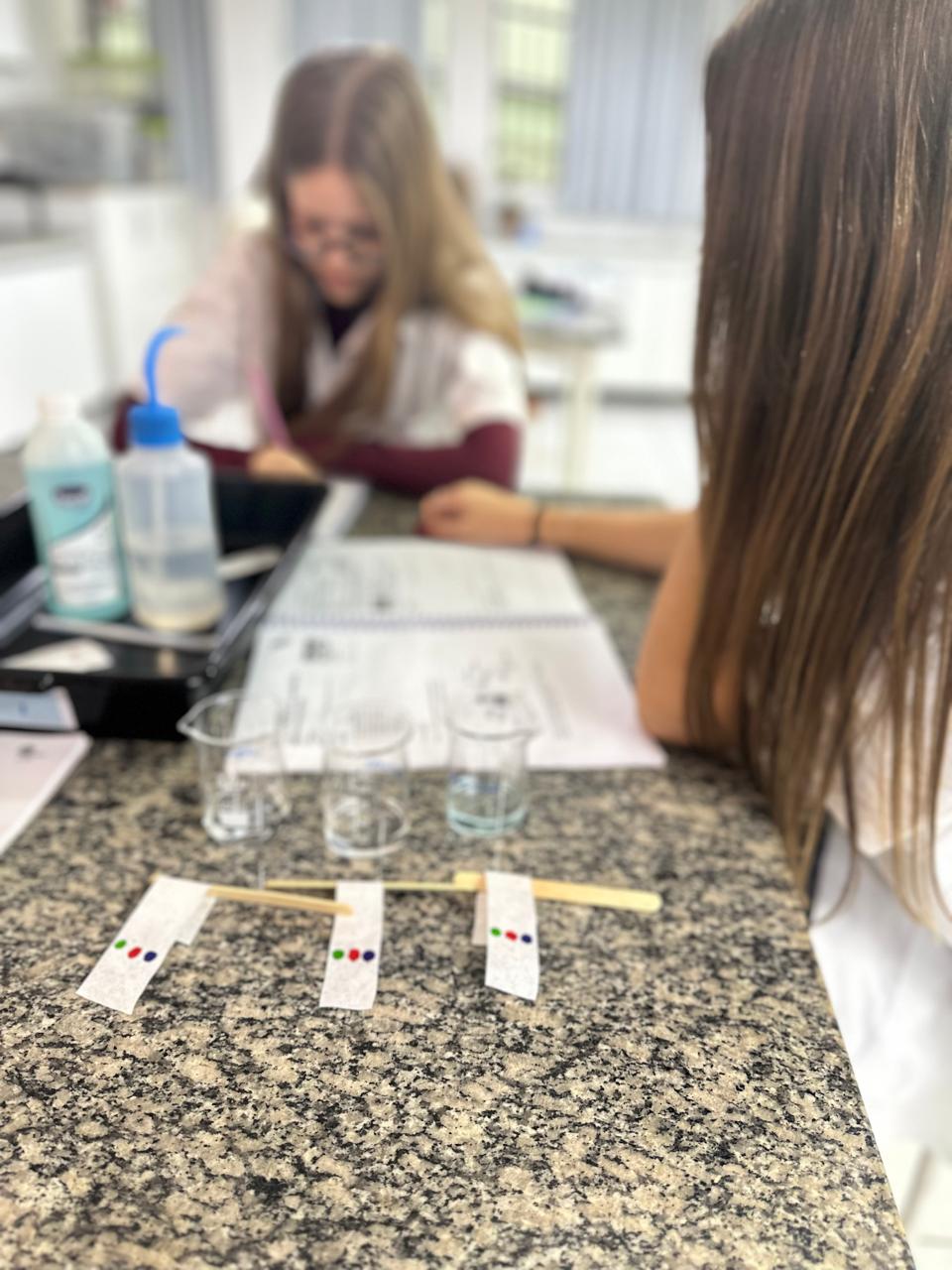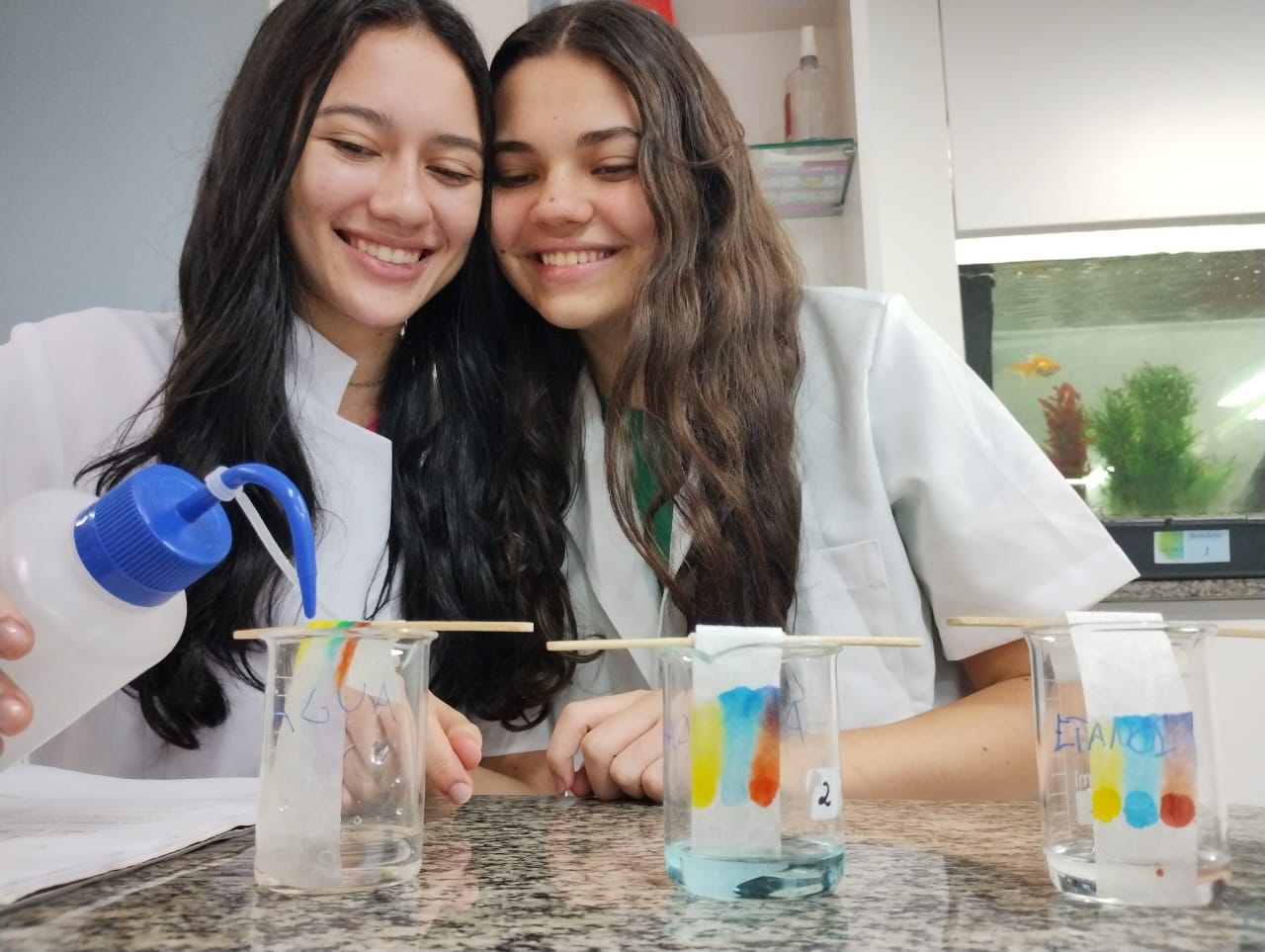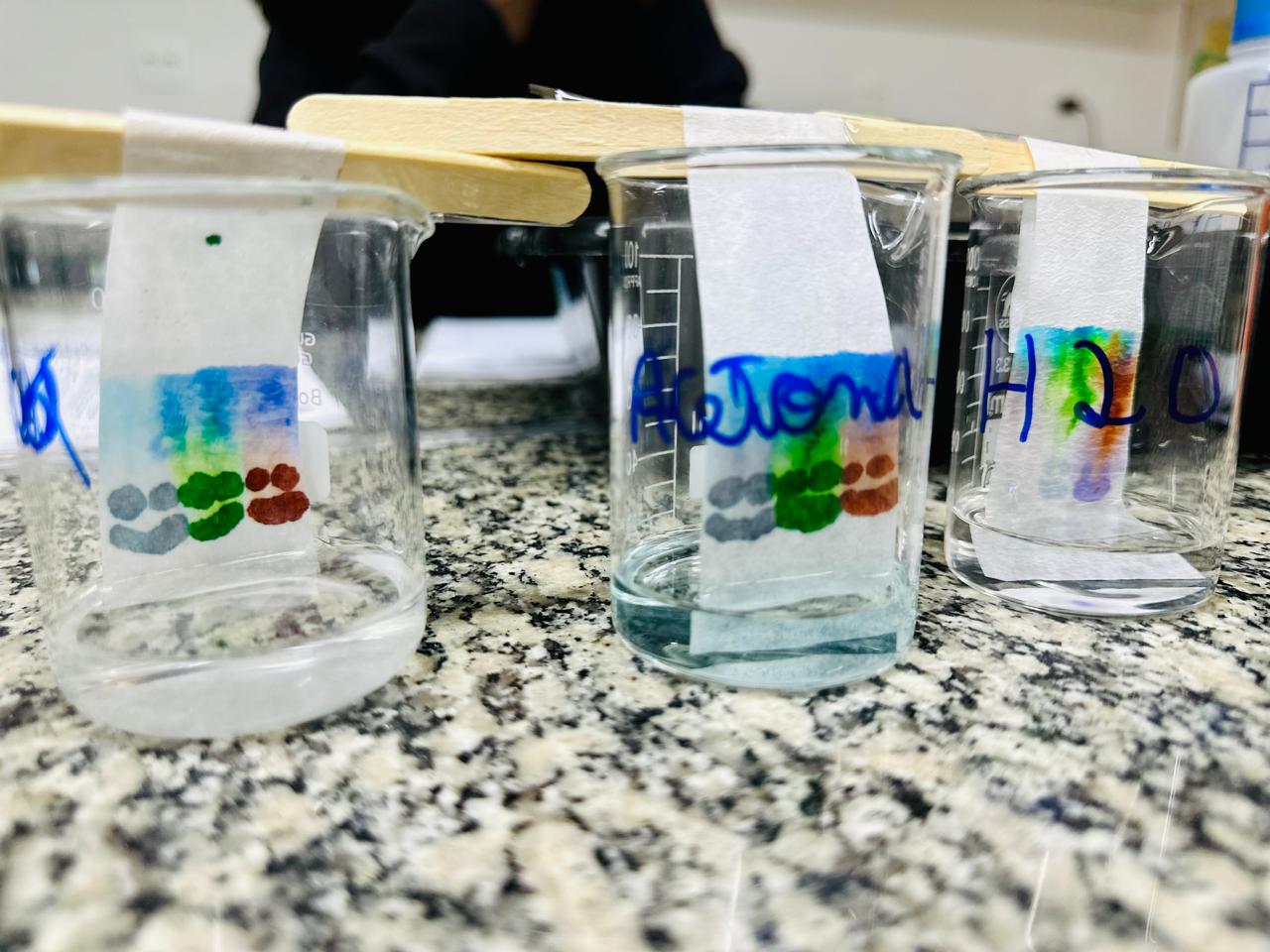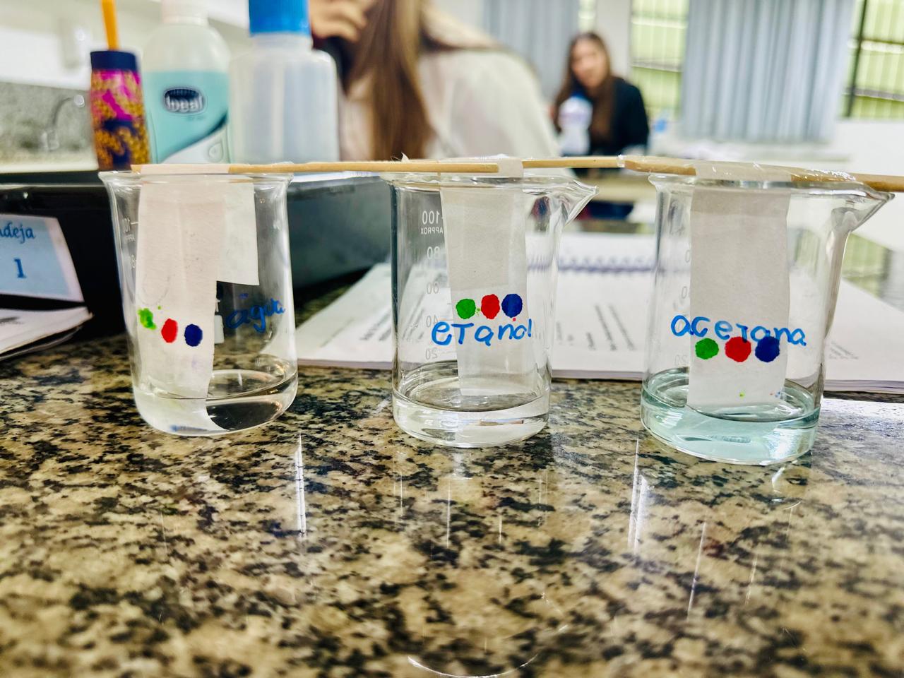 Na primeira etapa da atividade, observaram o funcionamento da destilação simples e compreenderam como essa técnica permite separar componentes de uma mistura com base na diferença de seus pontos de ebulição. Em seguida, aplicaram o processo de cromatografia para identificar os diferentes pigmentos presentes em canetas hidrocor, utilizando como fase móvel três solventes distintos: água, etanol e acetona.