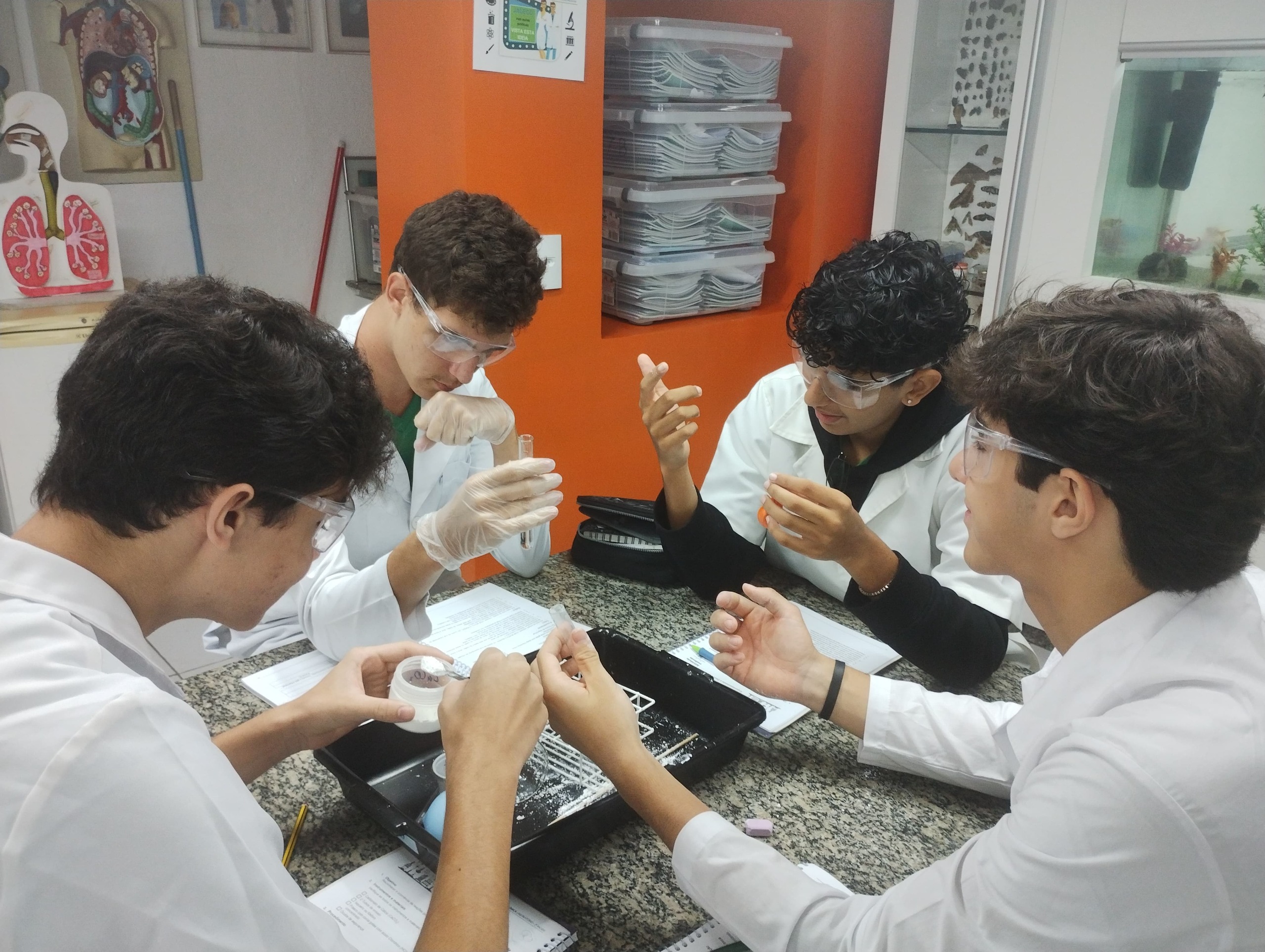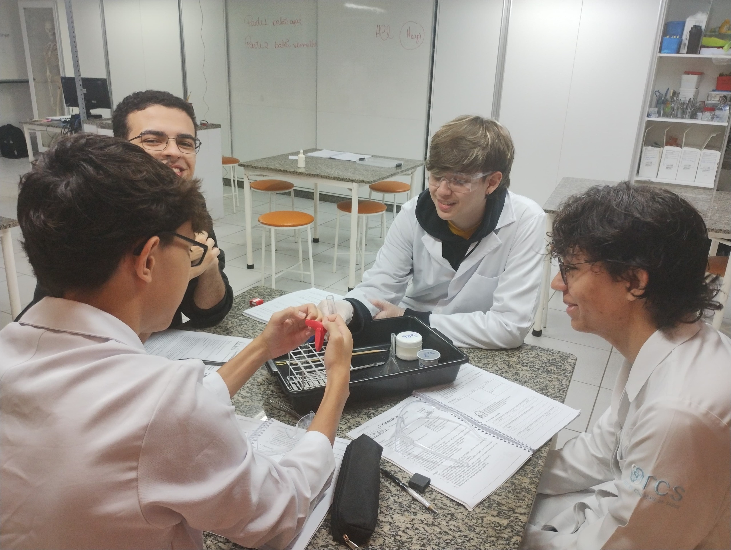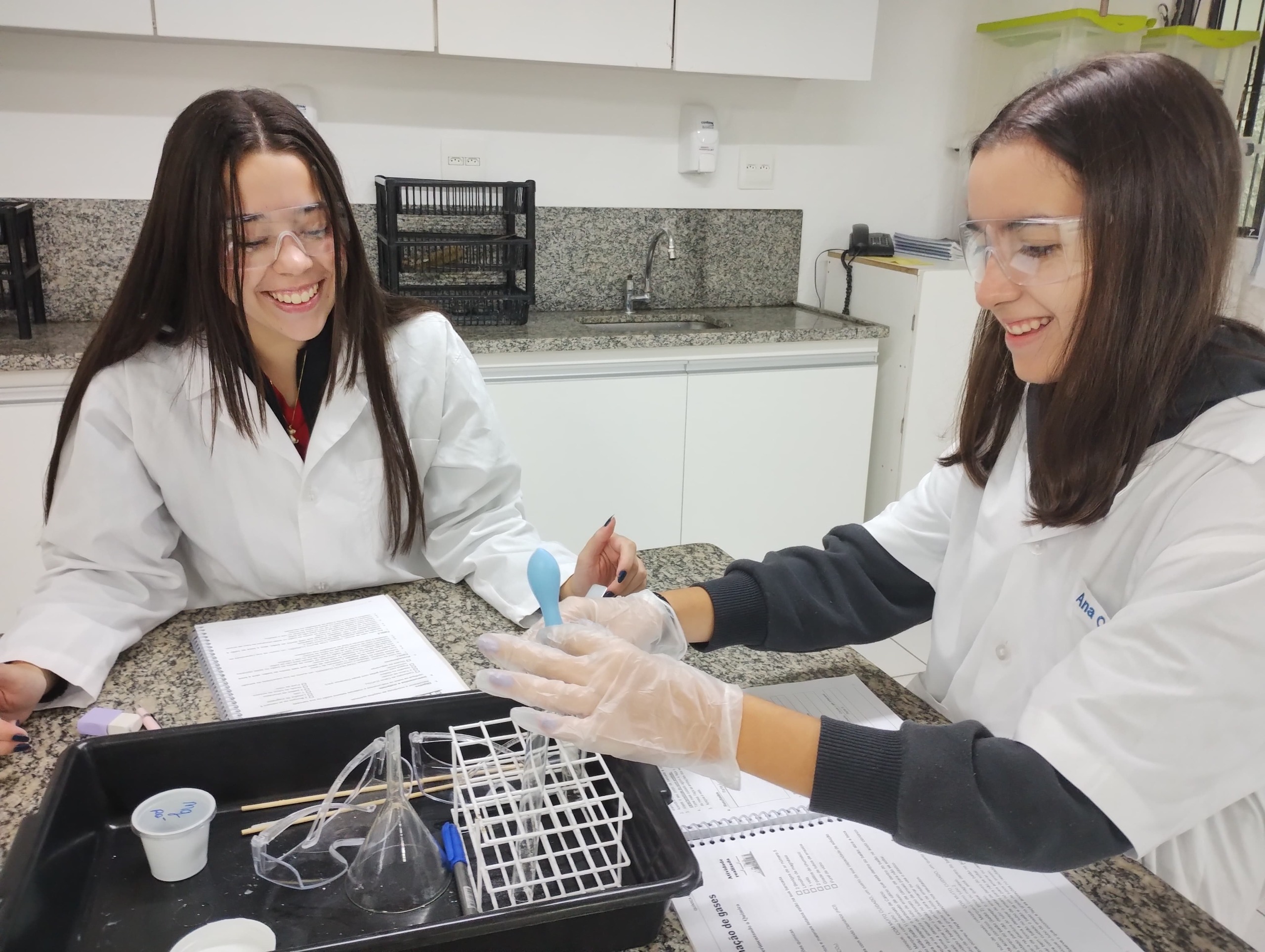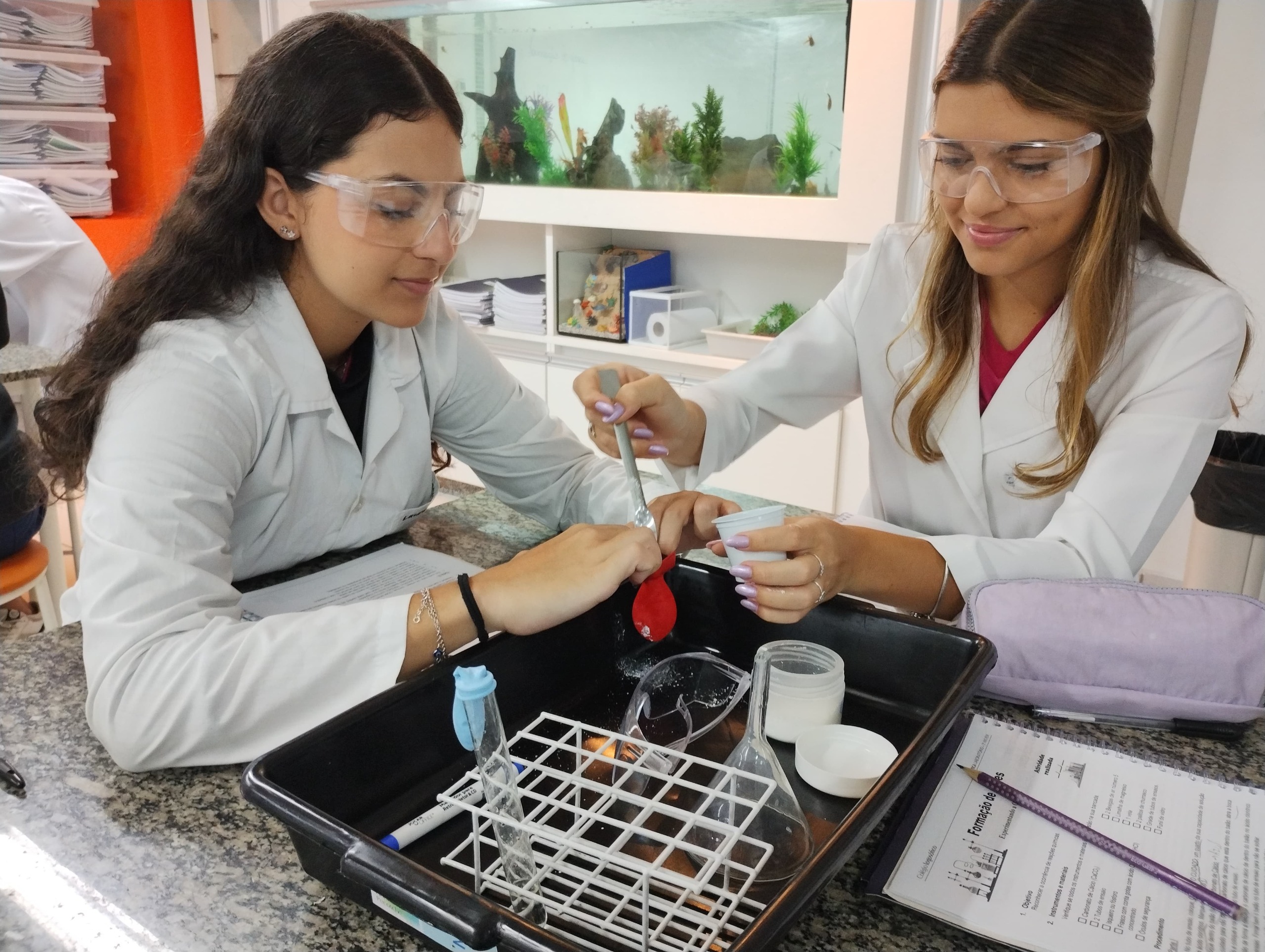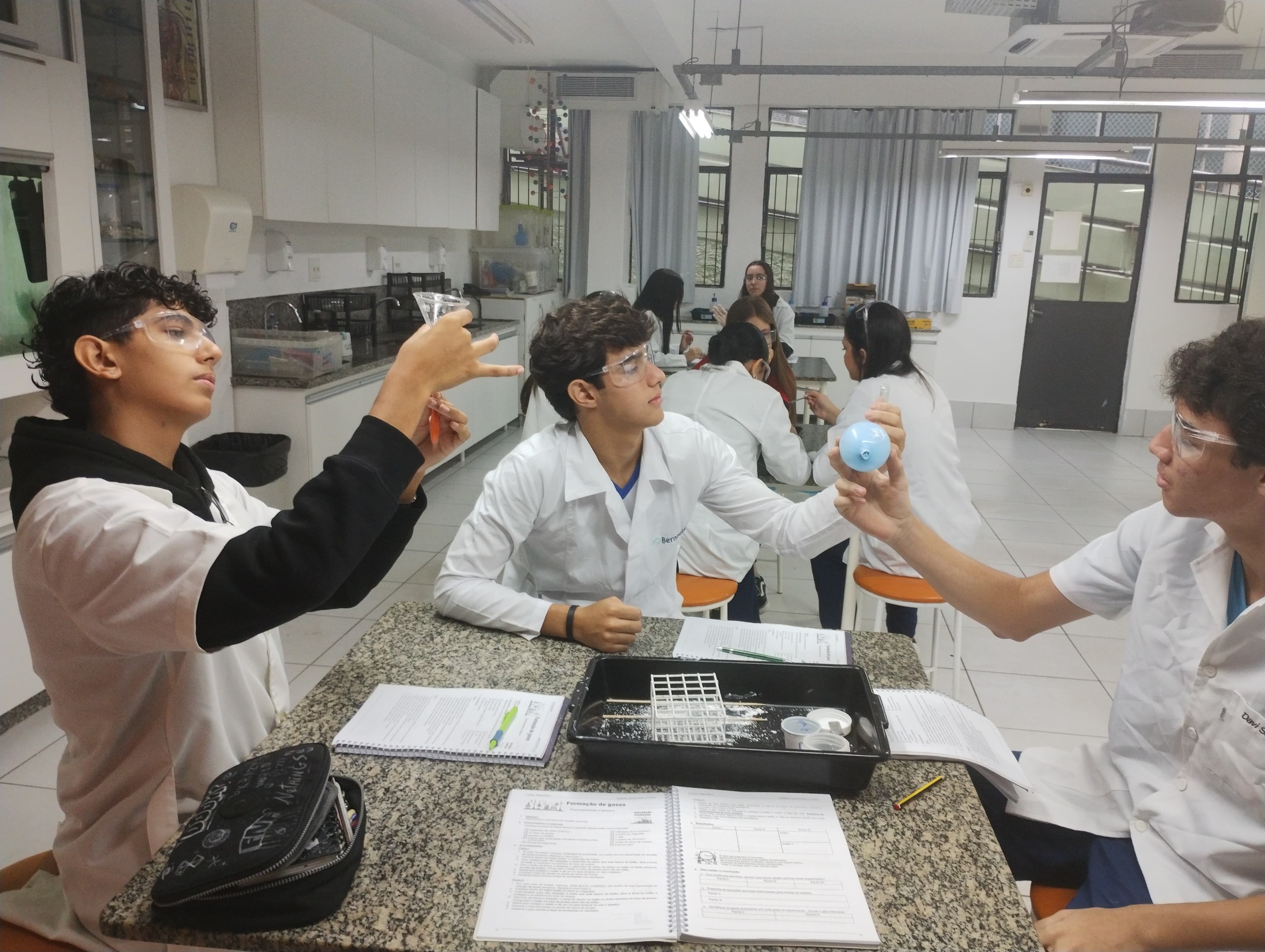 Os alunos da 2ª série do Ensino Médio do Colégio Logosófico participaram de uma aula experimental de Química, voltada à identificação de evidências de reações químicas e à formação de gases.