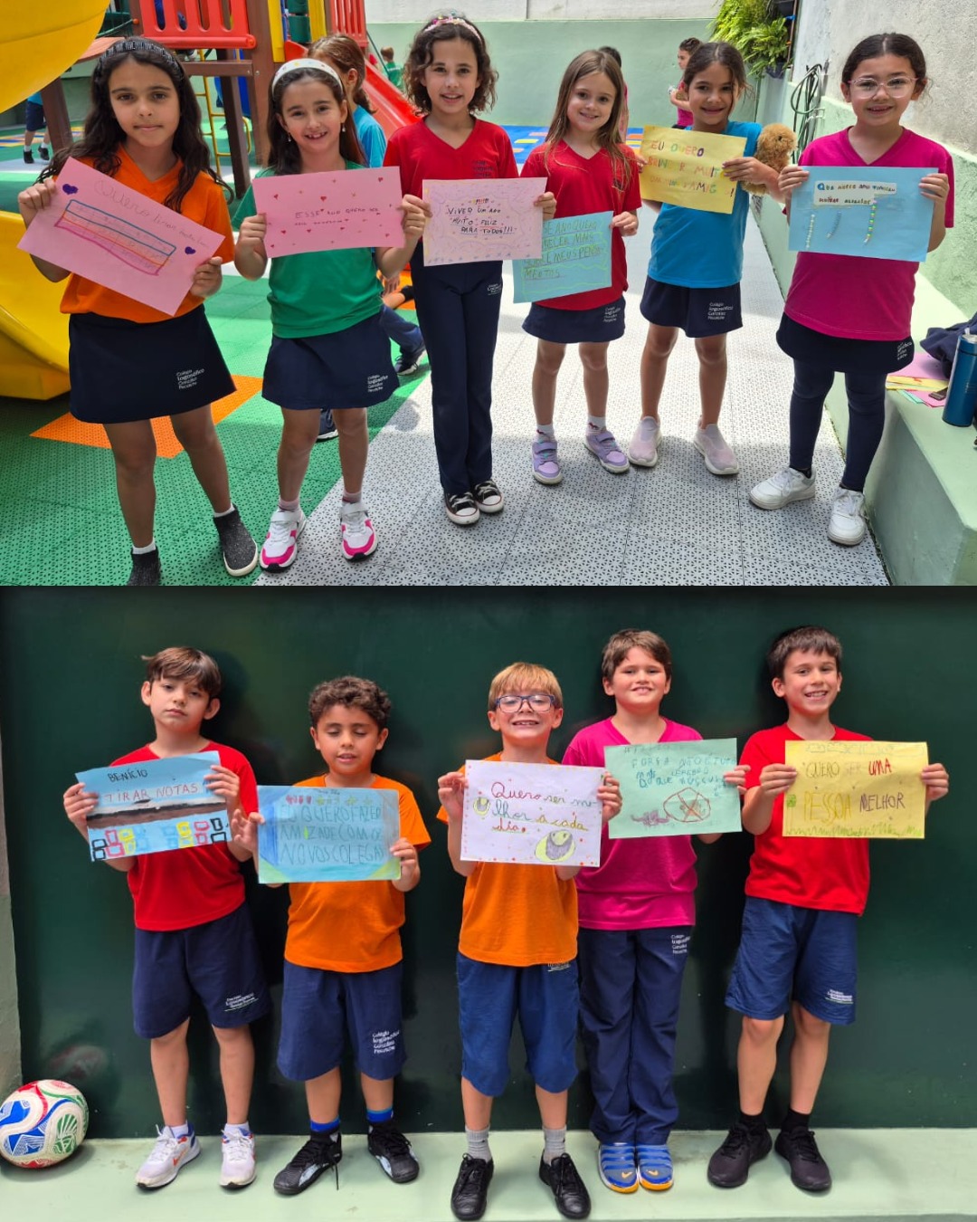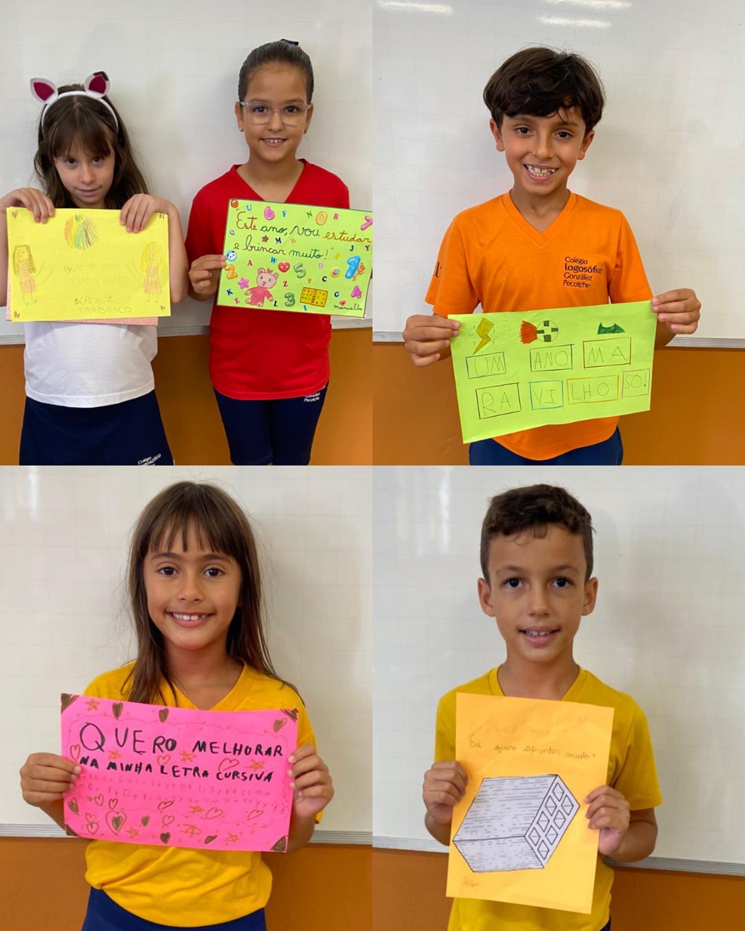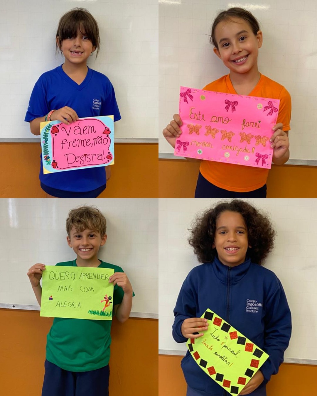 Entre as mensagens elaboradas, destacaram-se expressões de nobres intenções, como o desejo de aprender com alegria, superar desafios, cultivar amizades e buscar crescimento pessoal. Após a produção, os estudantes compartilharam seus cartazes com a turma, promovendo um momento de escuta e valorização das ideias de cada um.