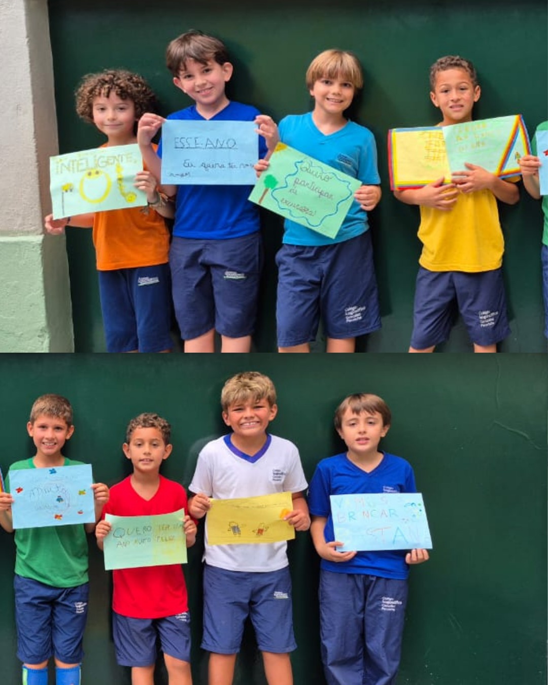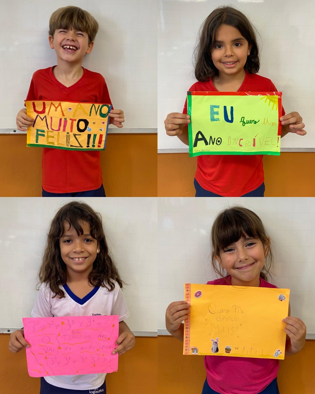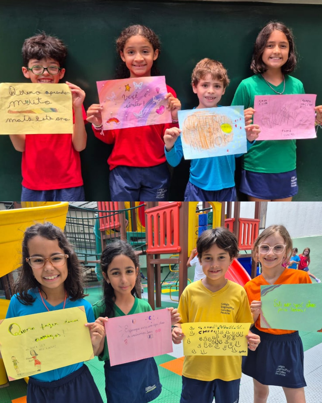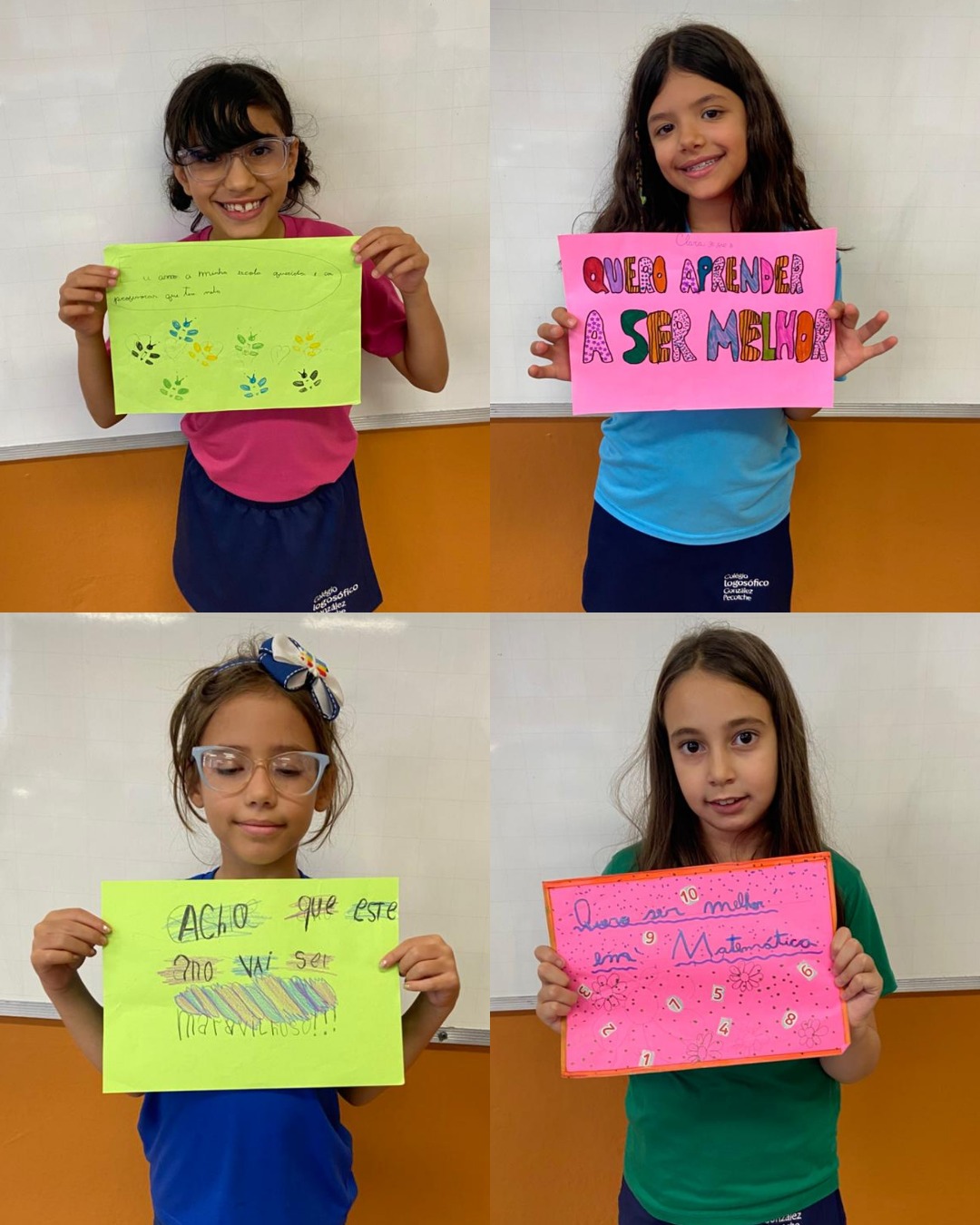 Entre as mensagens elaboradas, destacaram-se expressões de nobres intenções, como o desejo de aprender com alegria, superar desafios, cultivar amizades e buscar crescimento pessoal. Após a produção, os estudantes compartilharam seus cartazes com a turma, promovendo um momento de escuta e valorização das ideias de cada um.