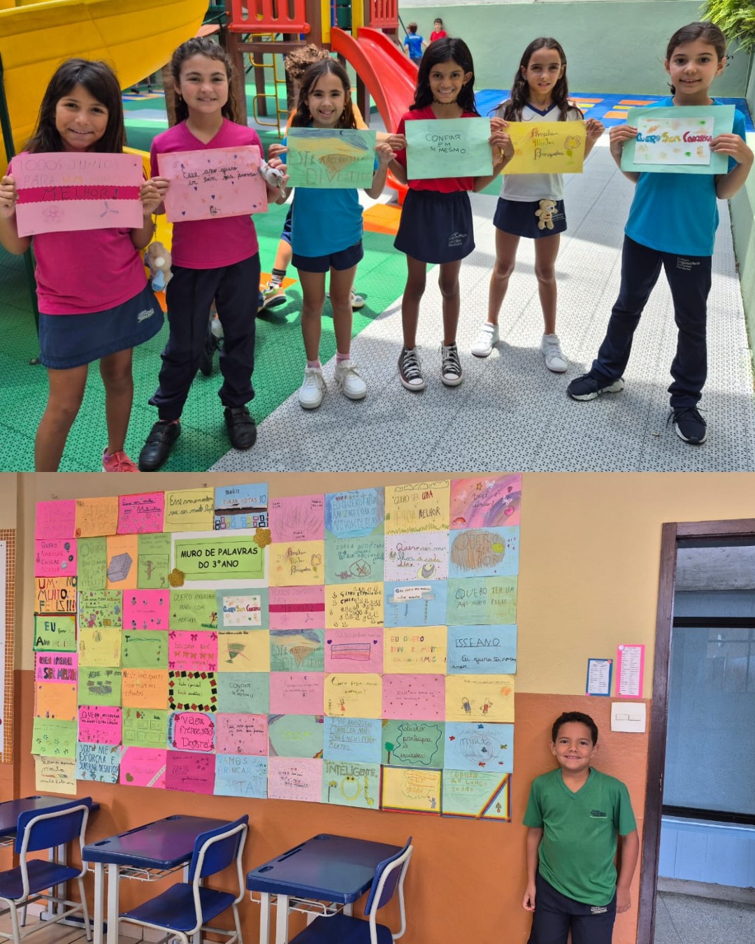 A partir dessa referência artística, a turma desenvolveu o Muro de Palavras do 3º Ano. Cada aluno produziu seu próprio “tijolo”, registrando uma frase sobre expectativas, sentimentos e propósitos para o ano, além de personalizá-lo com criatividade.