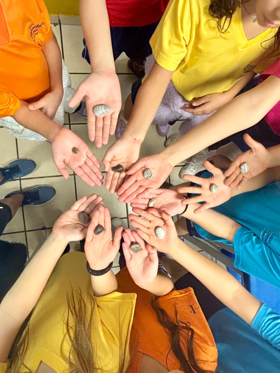 Ao final, todos ganharam uma pedrinha colhida pela professora nas praias dos mares Tirreno e Jônico. Esses mares ficam próximos ao Mediterrâneo, motivo de muitas de nossas aulas, onde os povos antigos realizavam comércio marítimo.