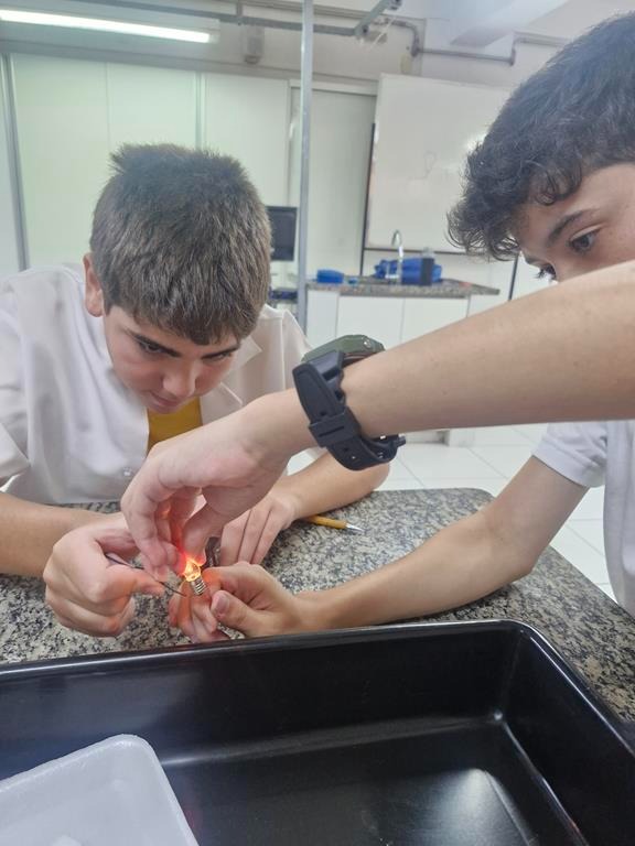 Durante a aula de laboratório, orientados pela professora Milena Almeida, os estudantes montaram um circuito simples e realizaram testes com diferentes materiais, investigando quais permitiam a passagem da corrente elétrica. A partir da experimentação, puderam observar resultados concretos e classificar os objetos como bons ou maus condutores.