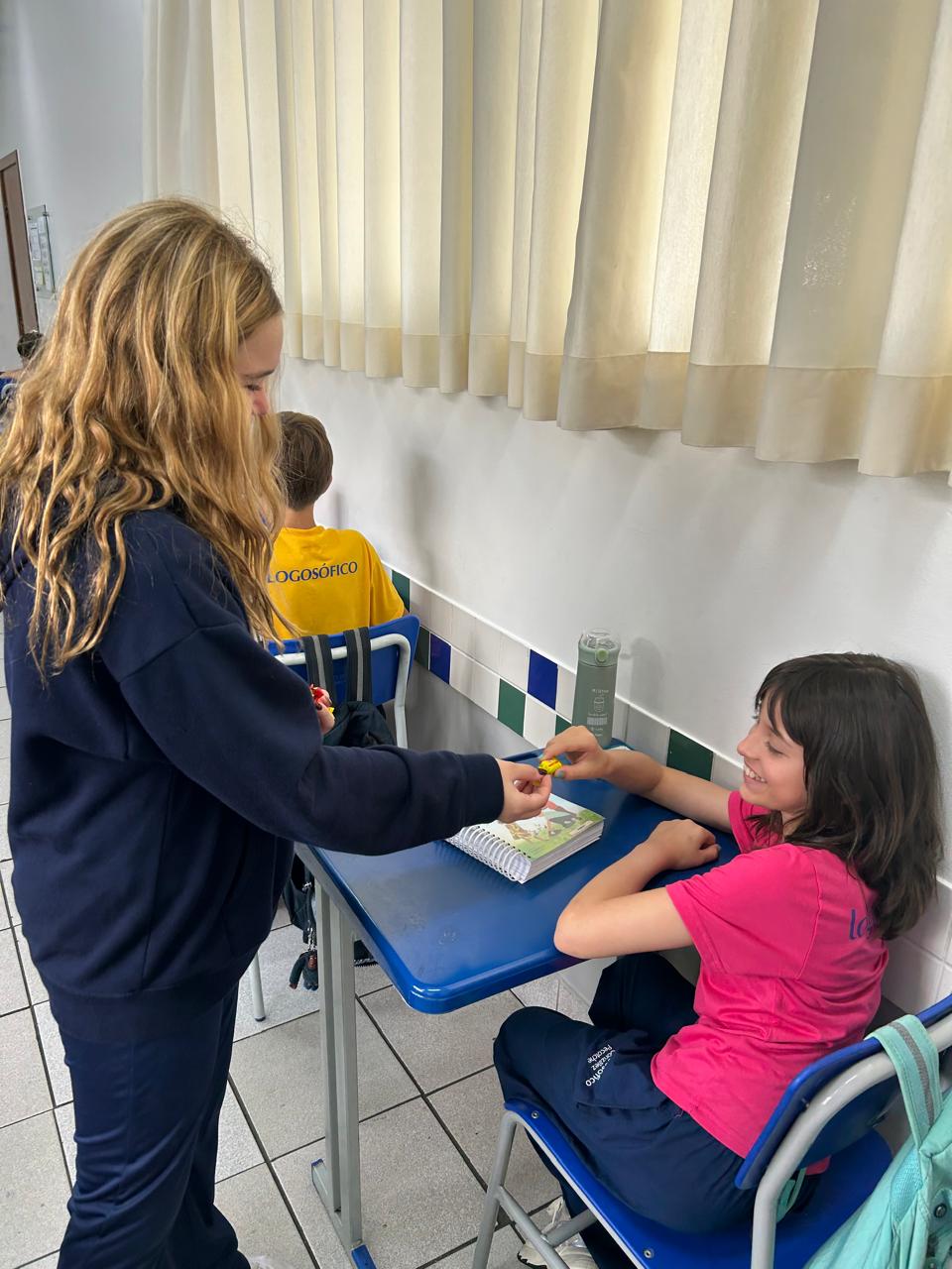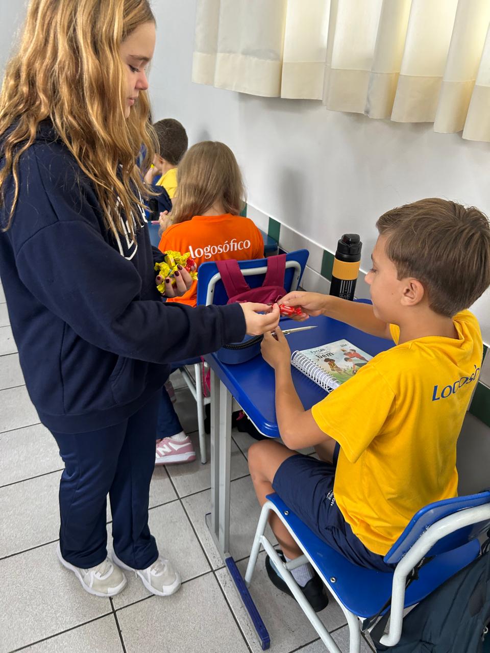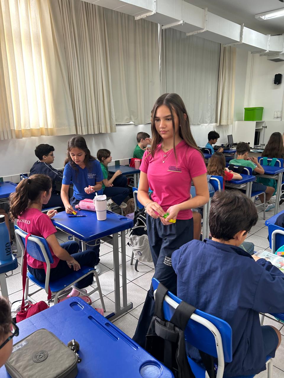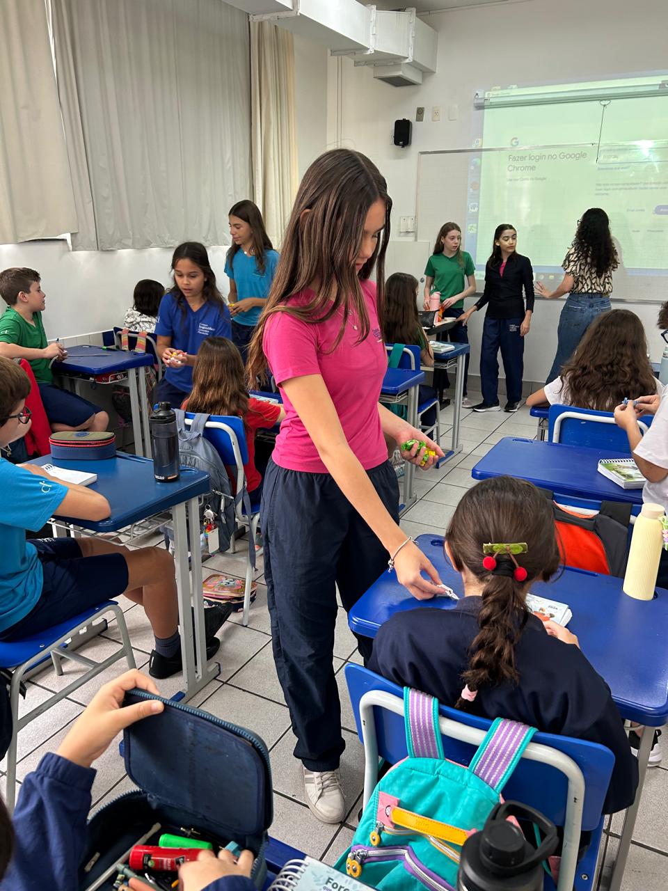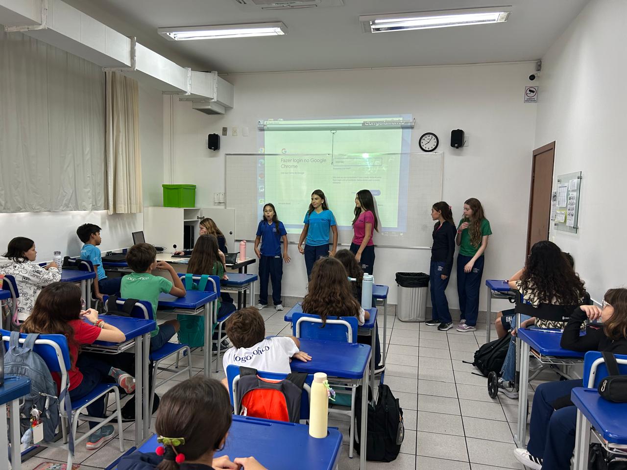 O projeto “Professor por um dia” proporcionou um momento especial de aprendizagem e troca entre os alunos. As alunas do 8º Ano protagonizaram a condução de uma aula para os estudantes do 6º Ano, compartilhando experiências sobre o esforço de conviver de forma ética e atenta ao outro.