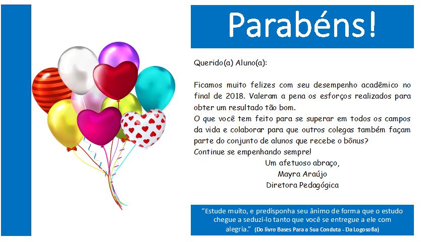 Estes alunos recebem, como parte da valorização de seu empenho, um bônus na mensalidade escolar para os próximos meses.