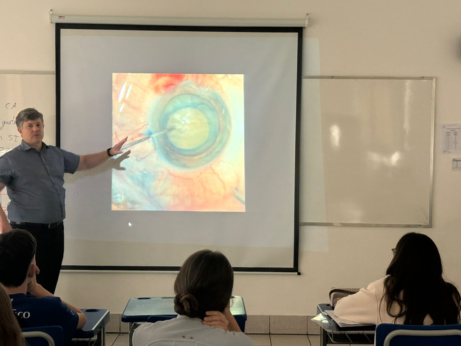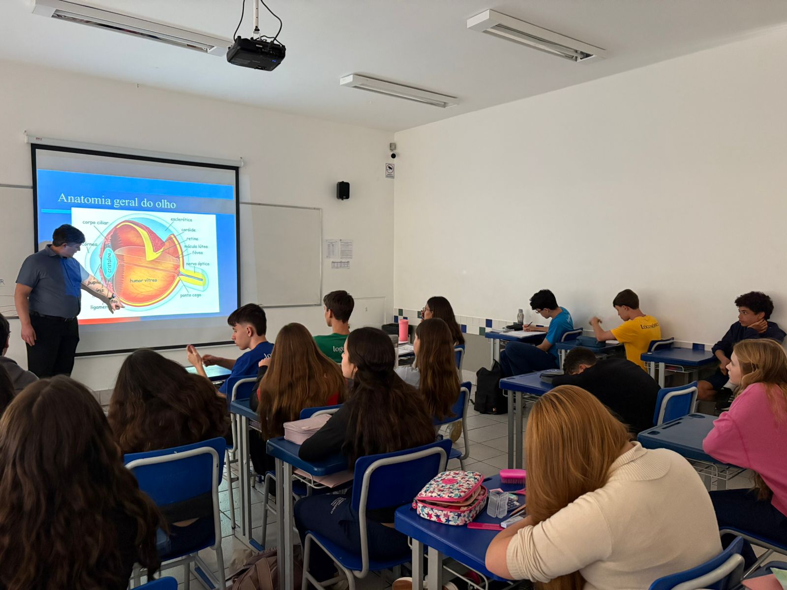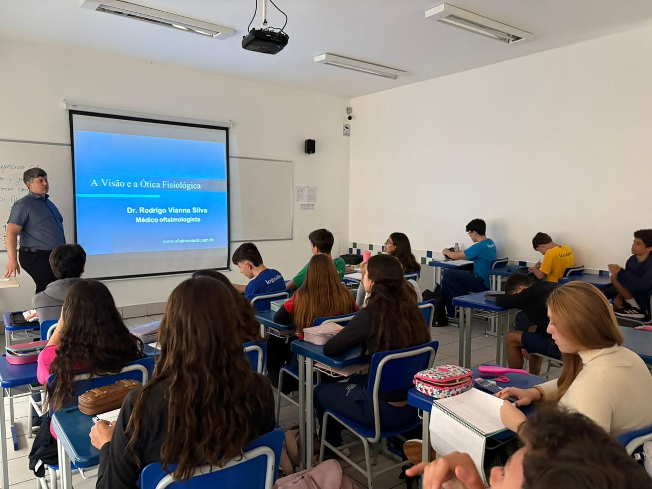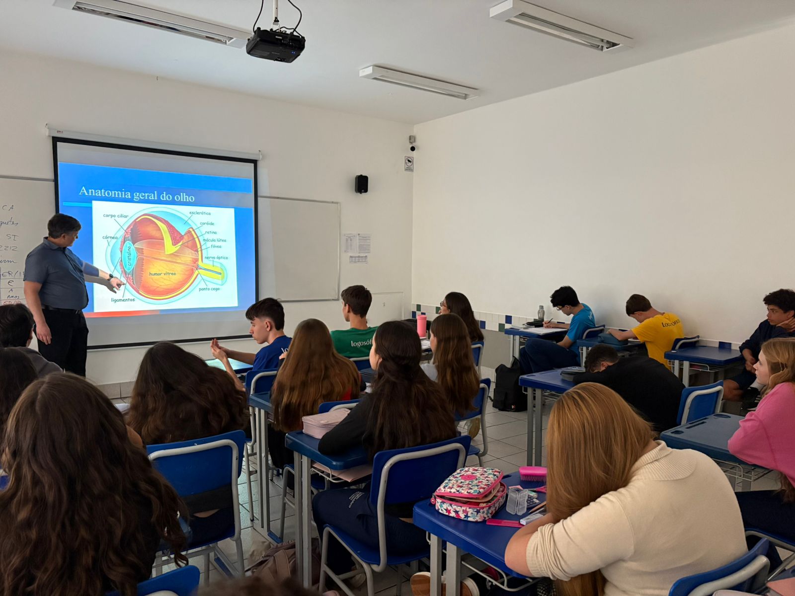 Para enriquecer esse aprendizado, receberam a visita do Dr. Rodrigo Vianna, médico oftalmologista, que aprofundou o conteúdo trabalhado em sala. Além de esclarecer diversas dúvidas, o especialista compartilhou curiosidades sobre o funcionamento do olho humano e apresentou vídeos de cirurgias realizadas por ele, despertando o interesse e a admiração dos estudantes.