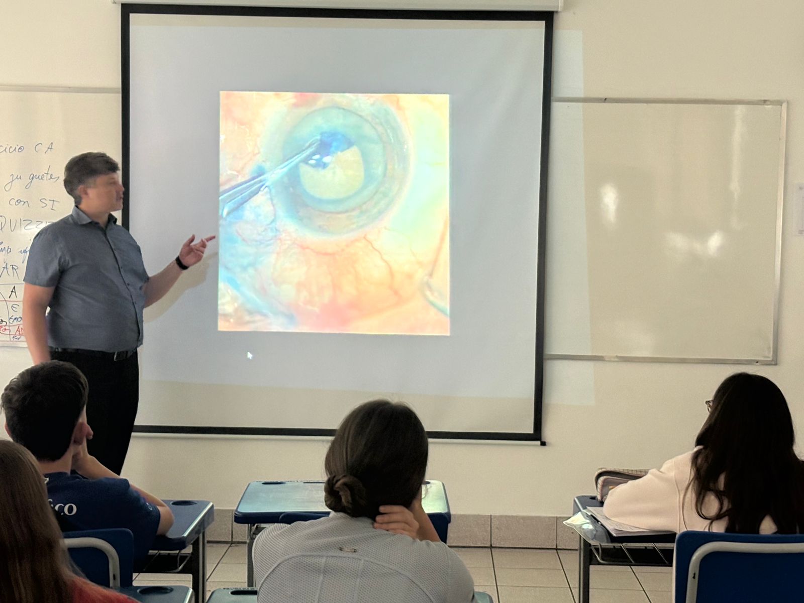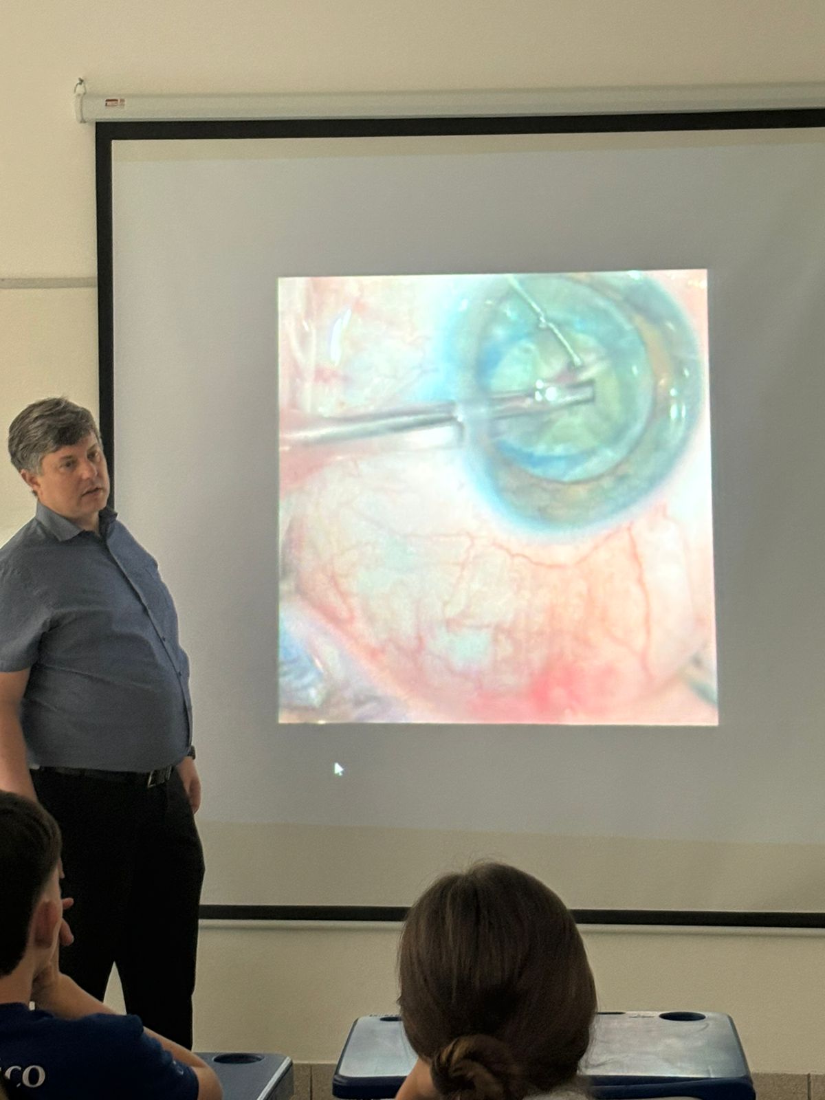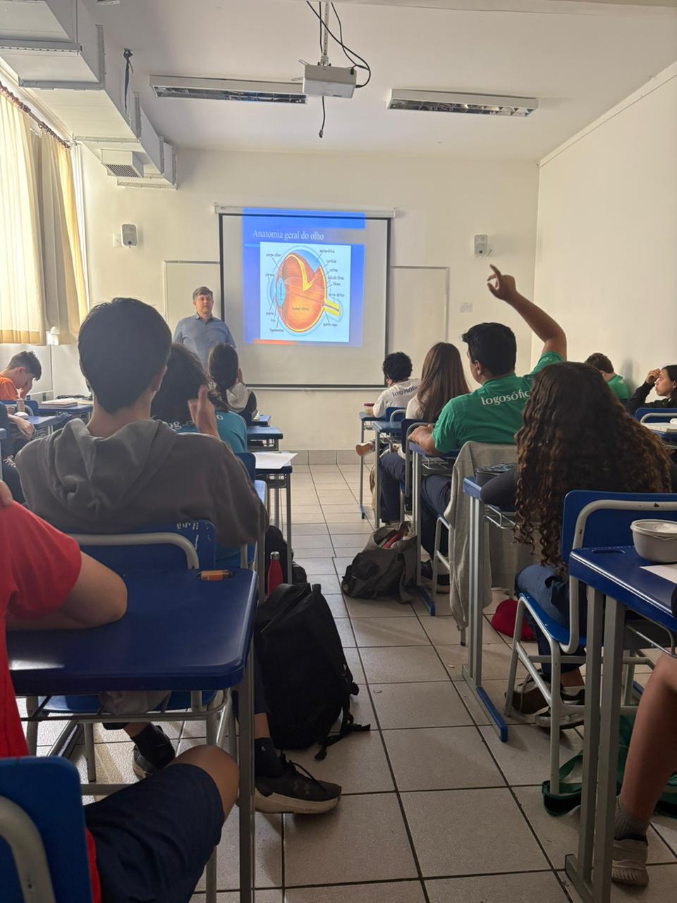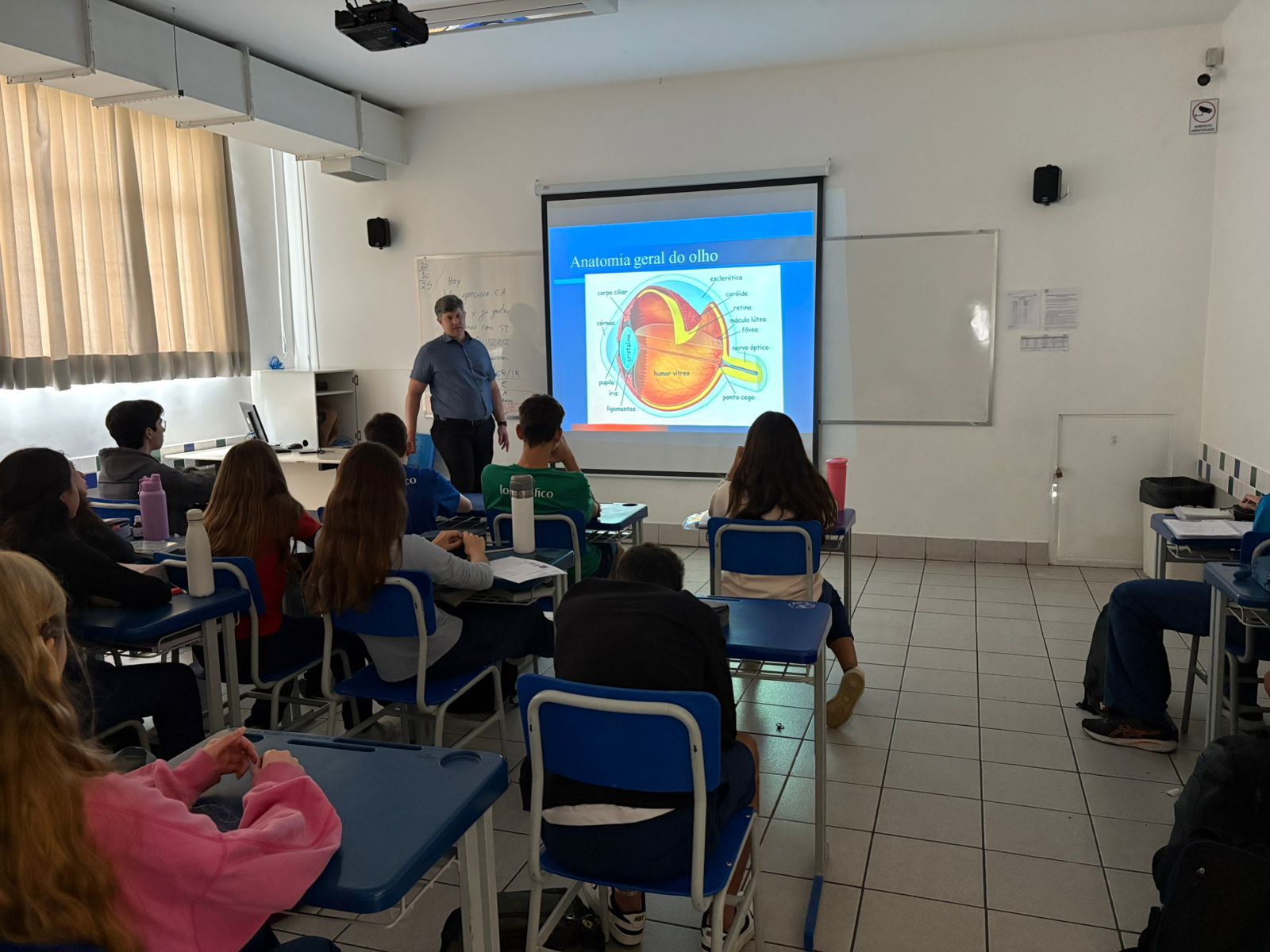 Para enriquecer esse aprendizado, receberam a visita do Dr. Rodrigo Vianna, médico oftalmologista, que aprofundou o conteúdo trabalhado em sala. Além de esclarecer diversas dúvidas, o especialista compartilhou curiosidades sobre o funcionamento do olho humano e apresentou vídeos de cirurgias realizadas por ele, despertando o interesse e a admiração dos estudantes.