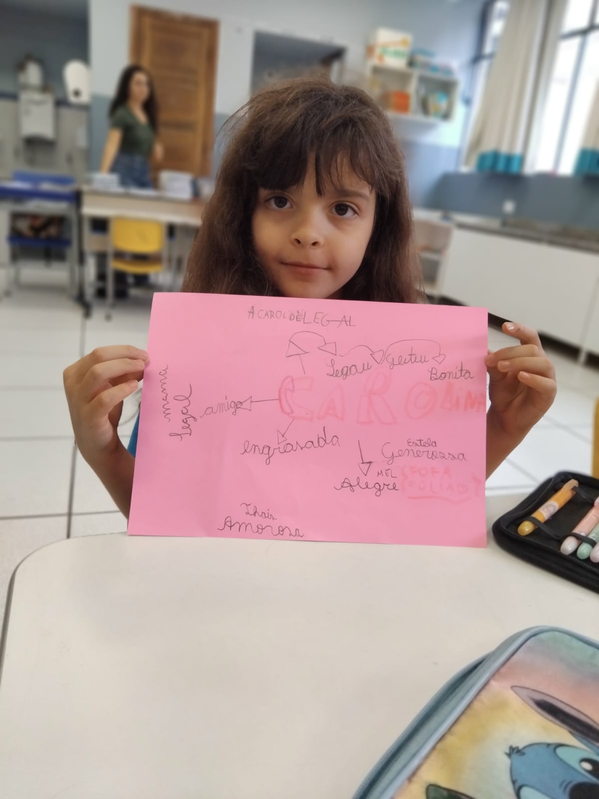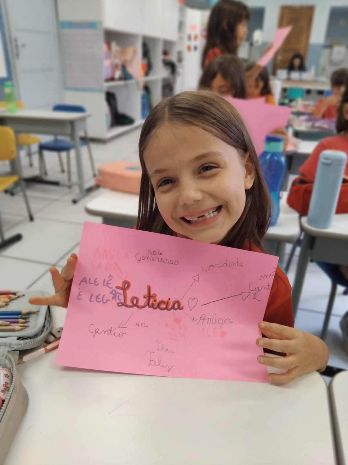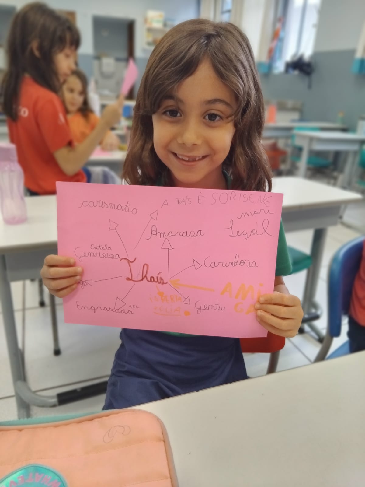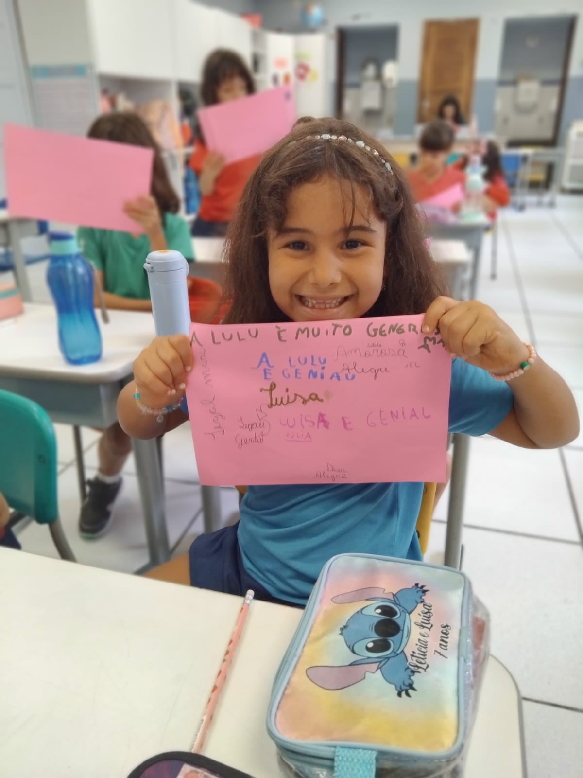 Para vivenciar essa experiência, uma dinâmica percorreu a turma: uma folha com o nome de cada aluno circulou entre os colegas, que pensaram em uma palavra positiva para oferecer ao amigo. A atividade promoveu sensibilidade, empatia e afeto, transformando o momento em uma vivência significativa que aqueceu os corações de todos os envolvidos.