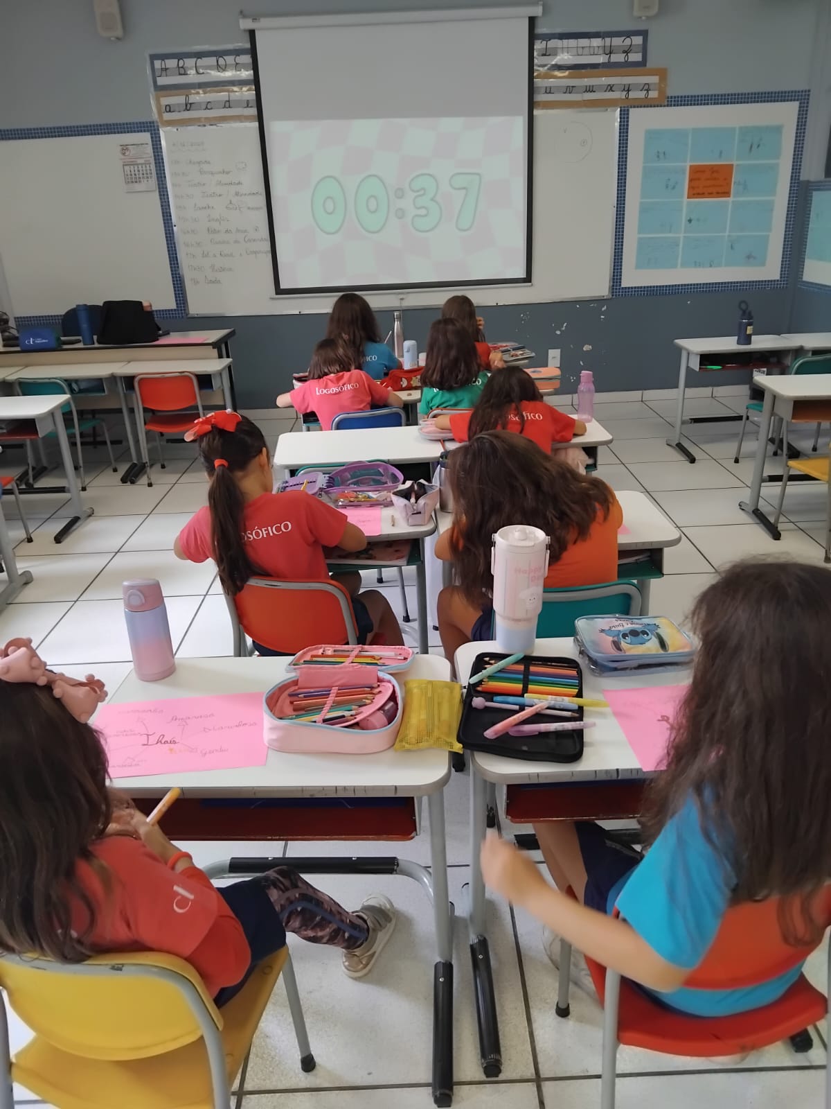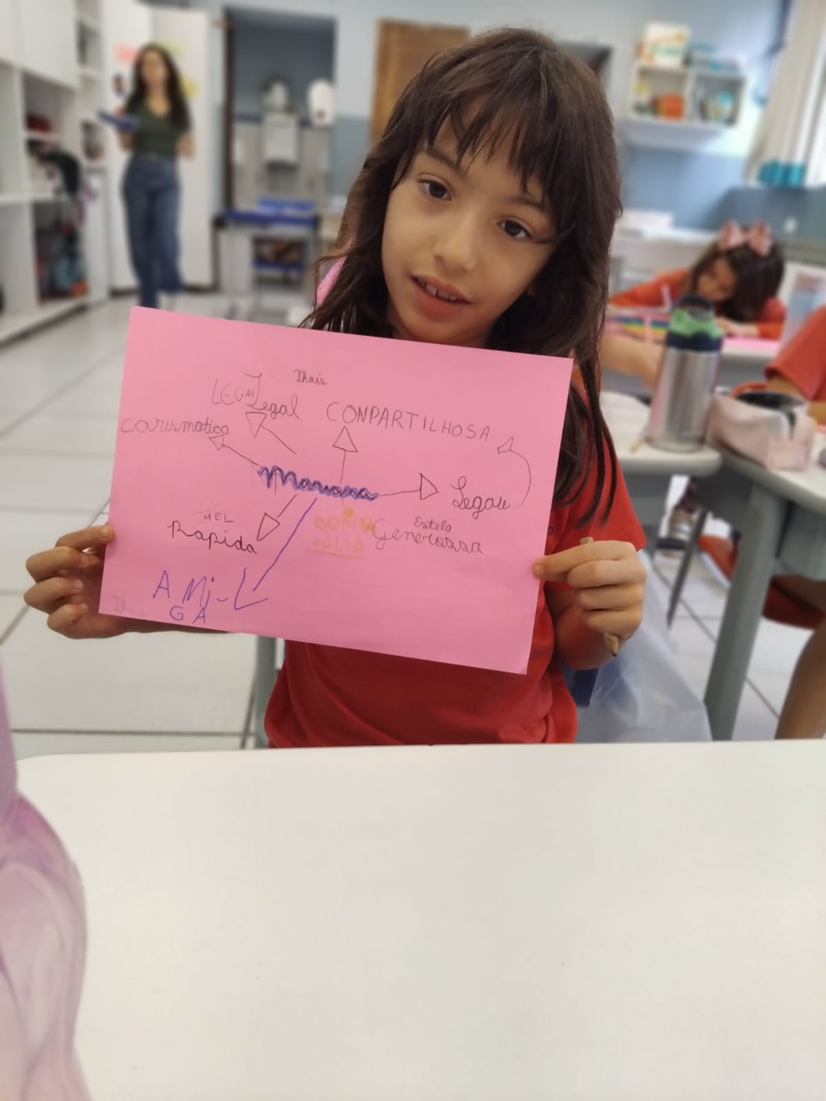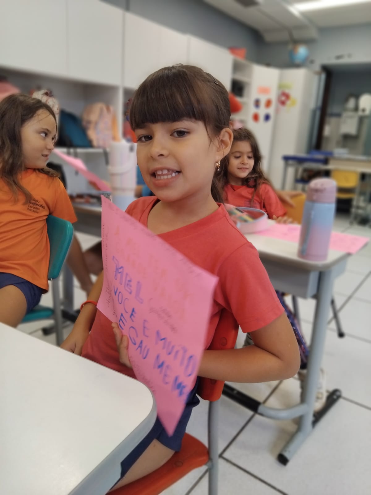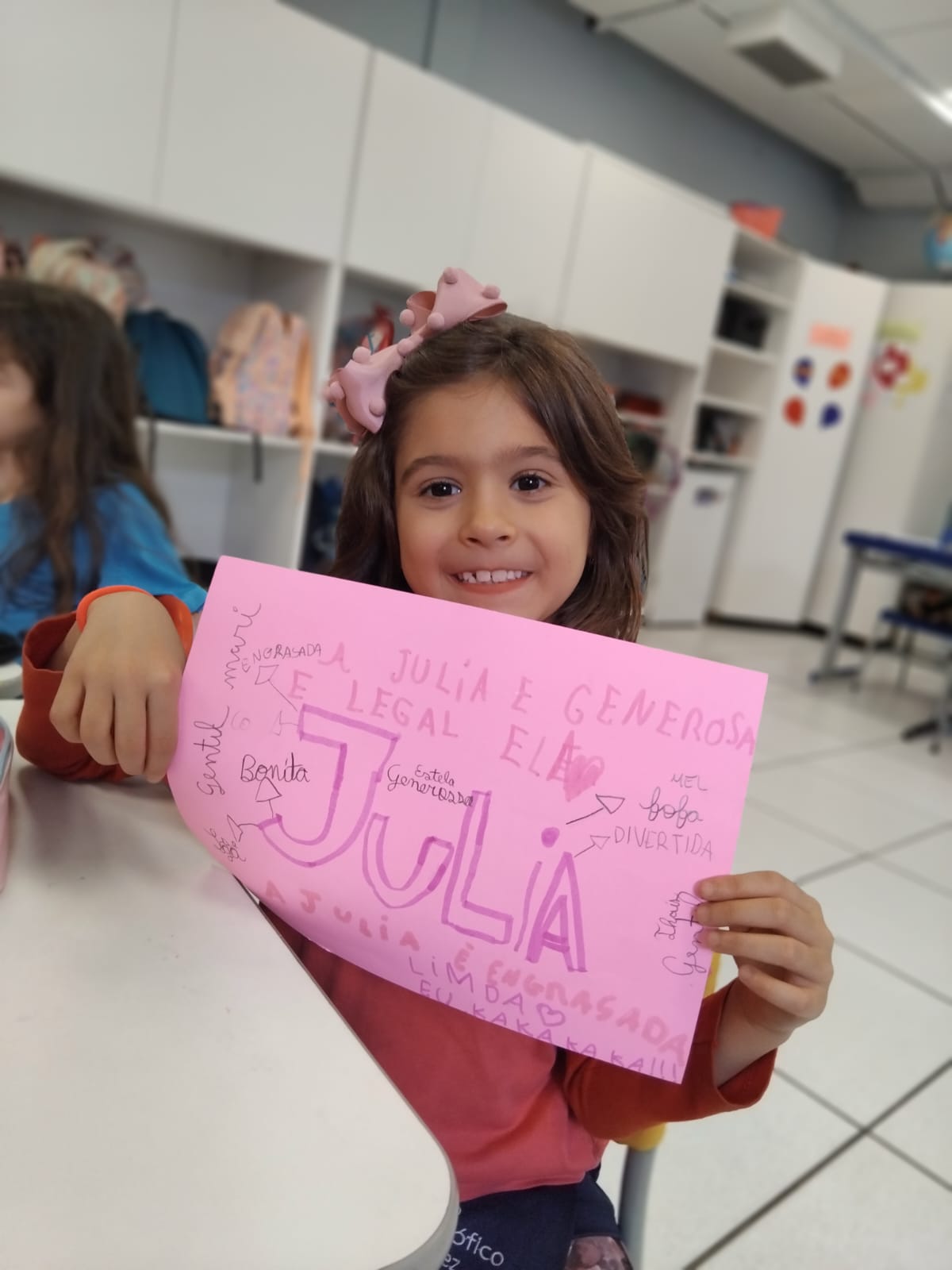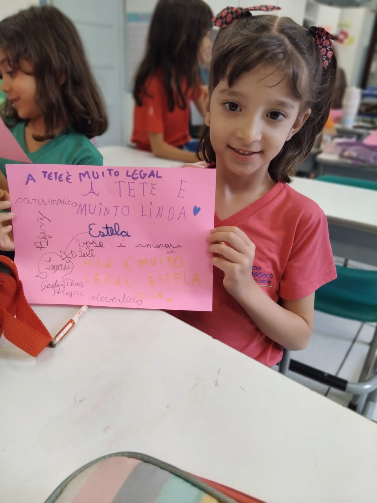 Para vivenciar essa experiência, uma dinâmica percorreu a turma: uma folha com o nome de cada aluno circulou entre os colegas, que pensaram em uma palavra positiva para oferecer ao amigo. A atividade promoveu sensibilidade, empatia e afeto, transformando o momento em uma vivência significativa que aqueceu os corações de todos os envolvidos.