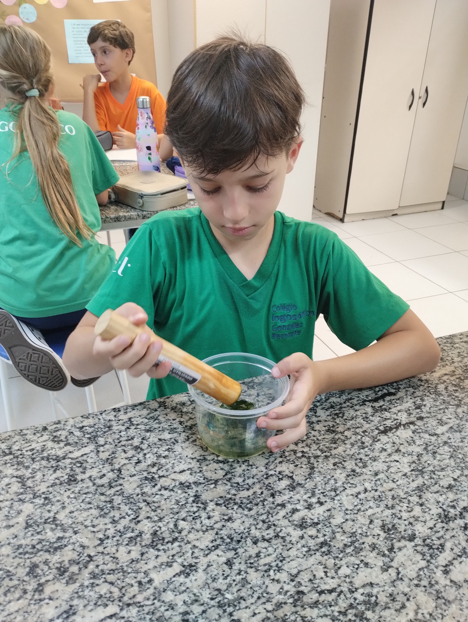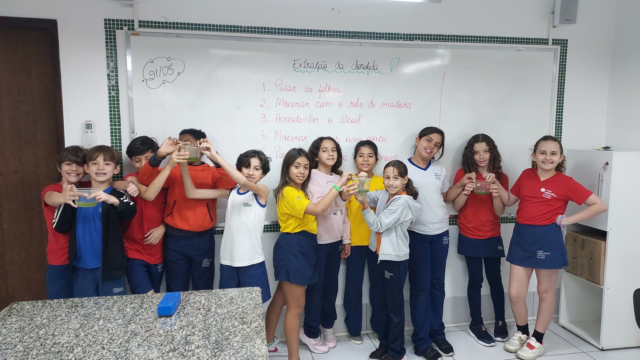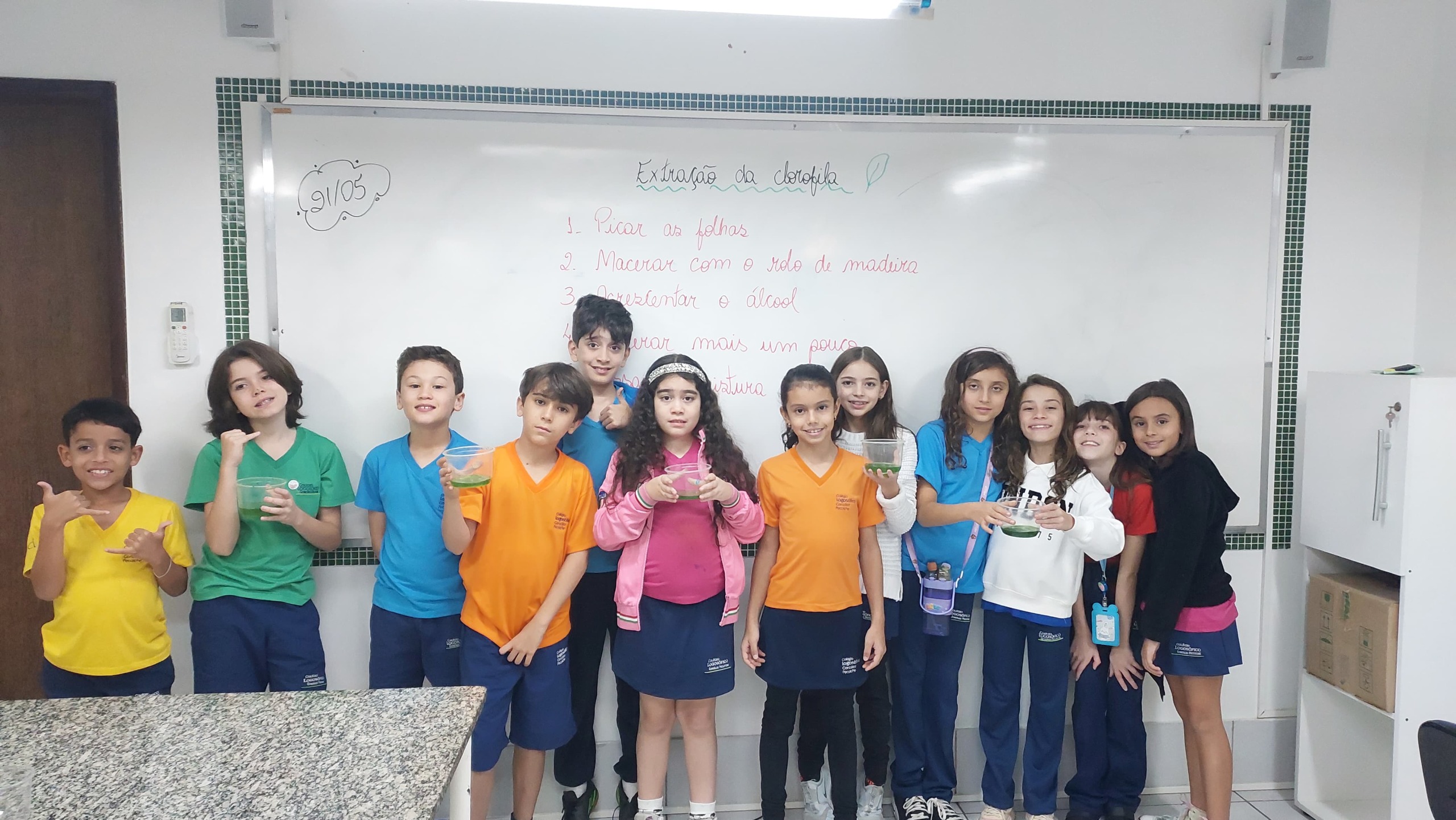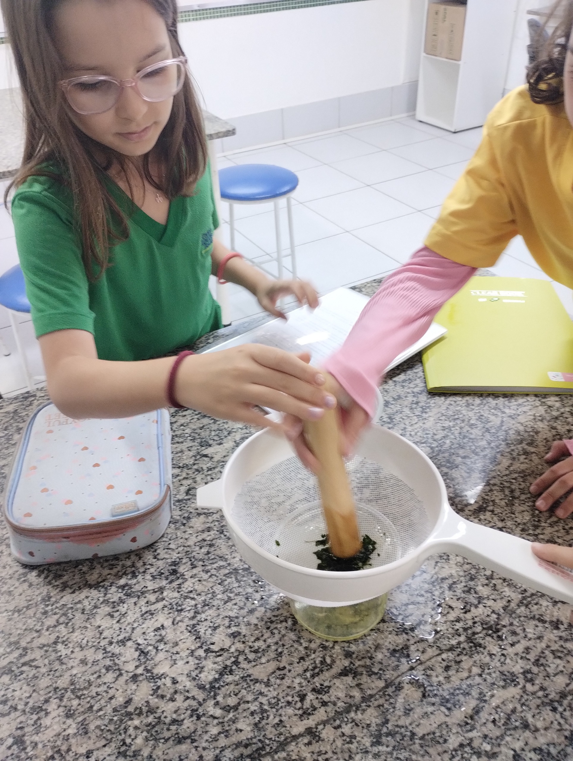 Durante as aulas de Ciências, os alunos do 4º ano realizaram a extração de clorofila das folhas – e o resultado foi surpreendente!