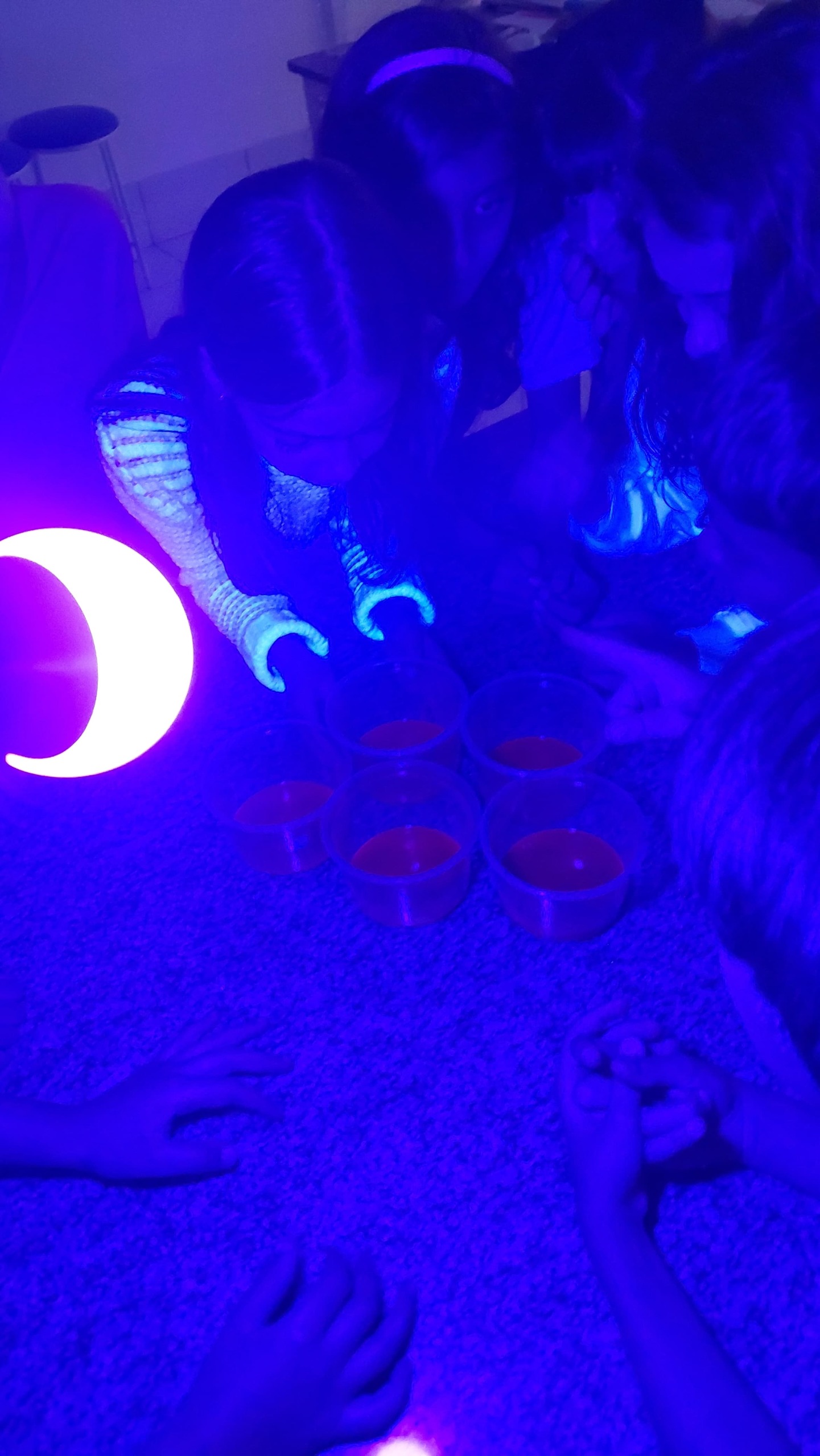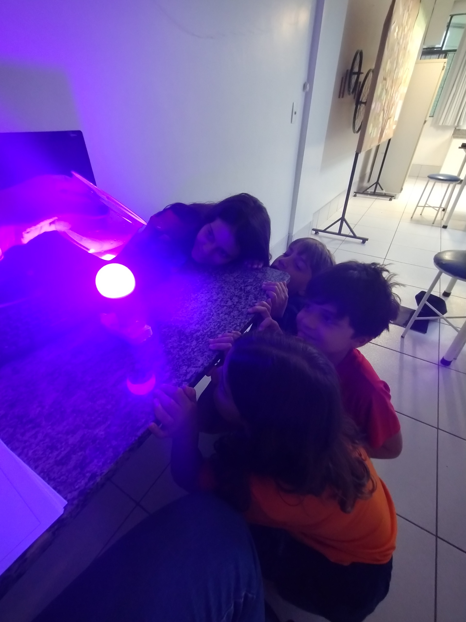 Em um momento de encantamento, observaram a mudança de cor do líquido ao ser exposto à luz negra: do verde intenso, passou a brilhar em tons de rosa e vermelho!