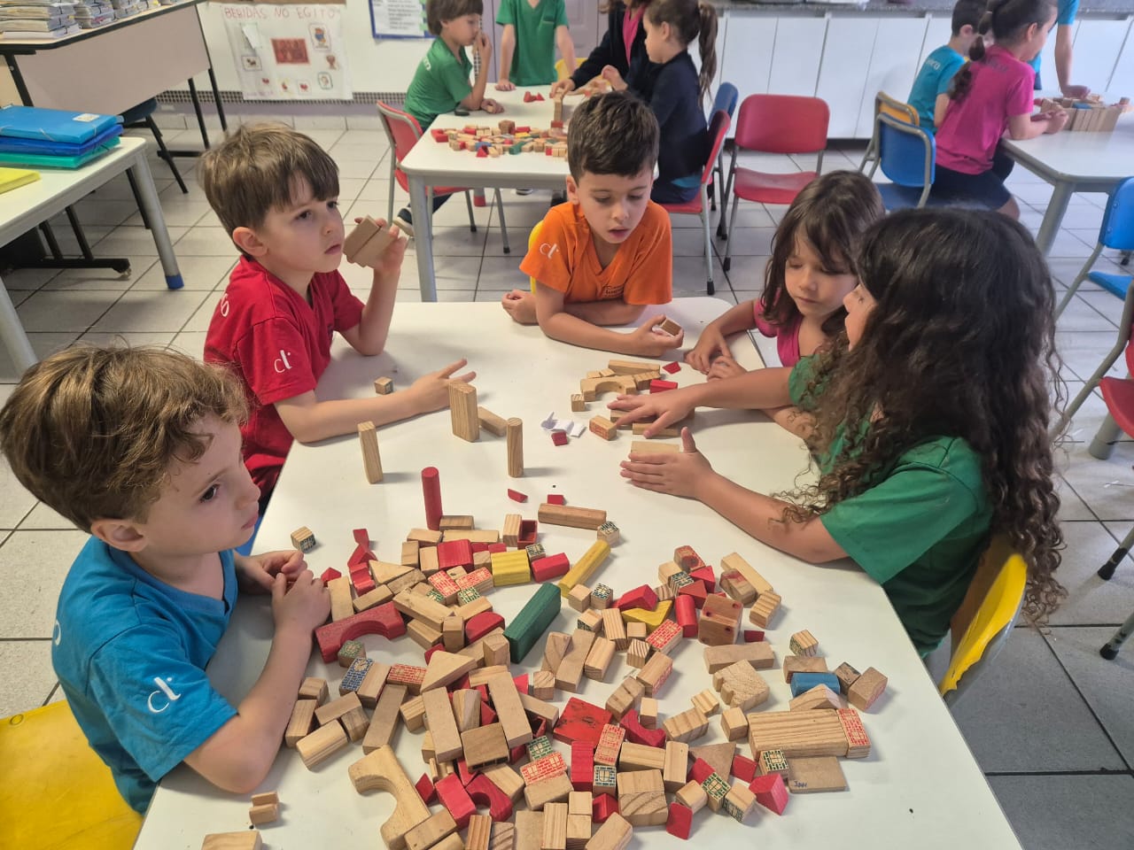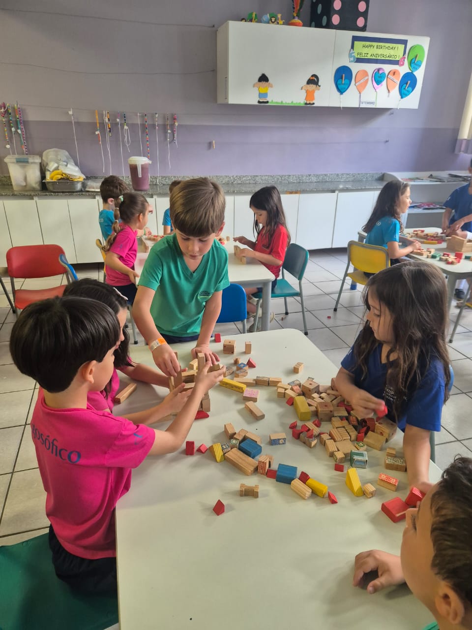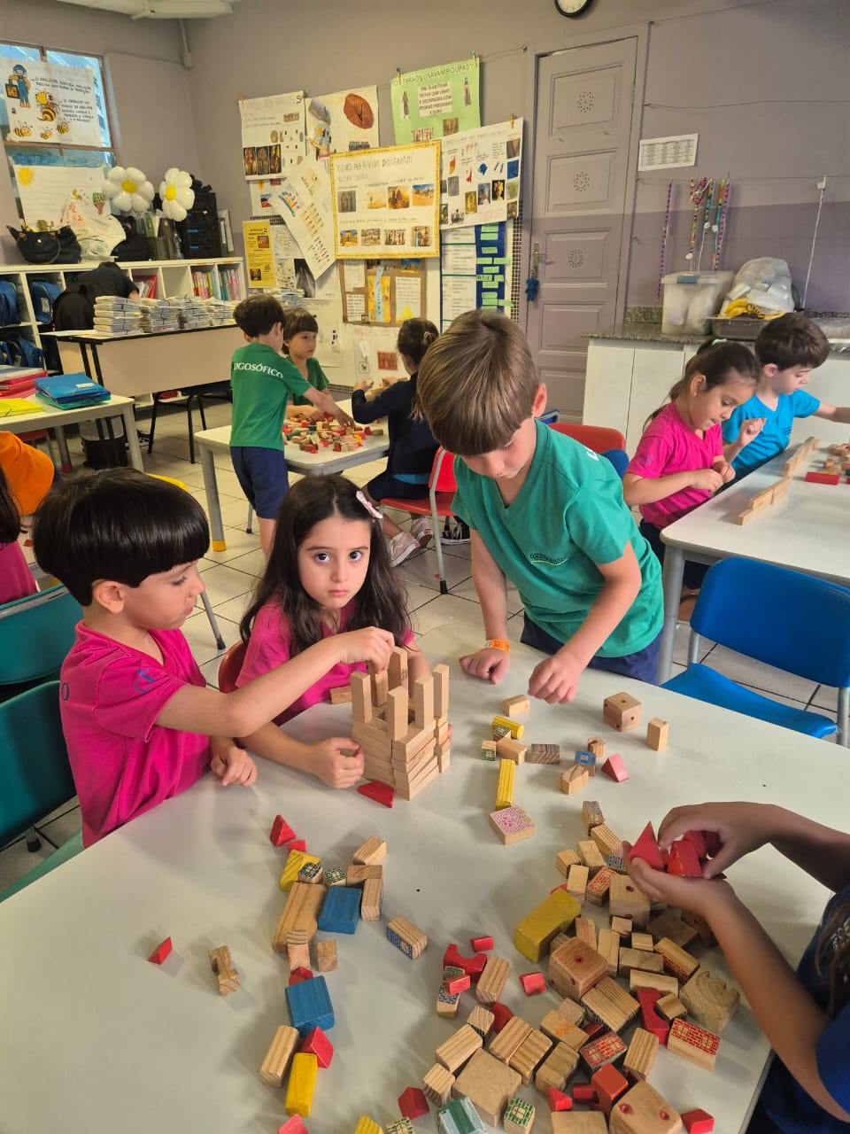 Como parte do Projeto Egito, as professoras Fernanda e Shirléa lançaram um desafio especial: cada mesa deveria construir uma pirâmide com blocos de madeira.