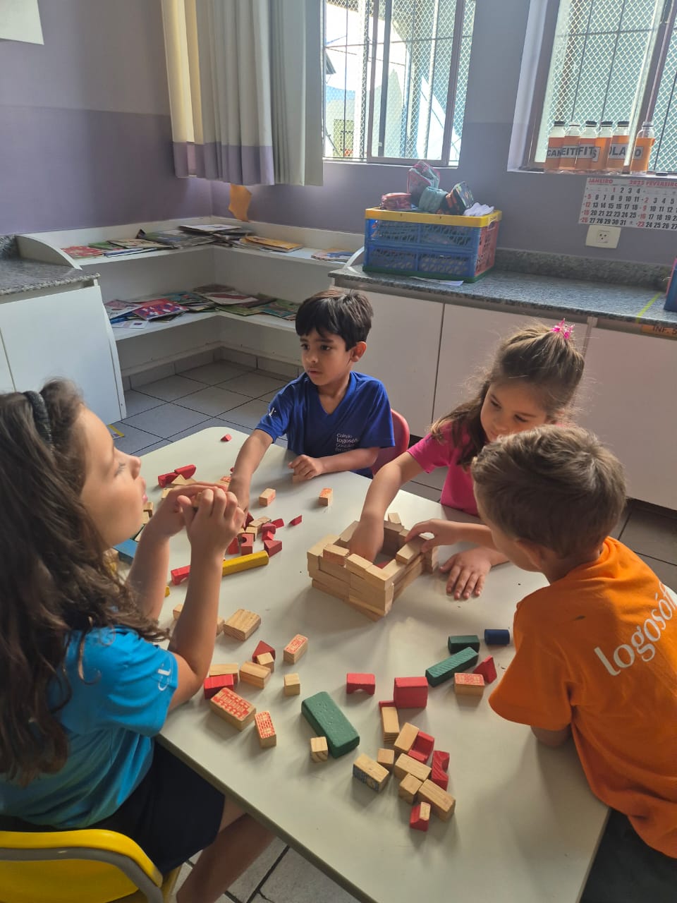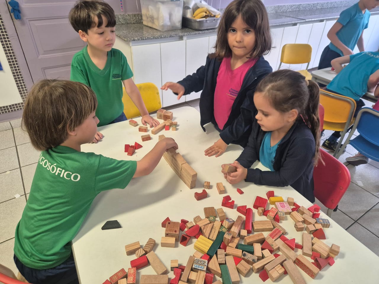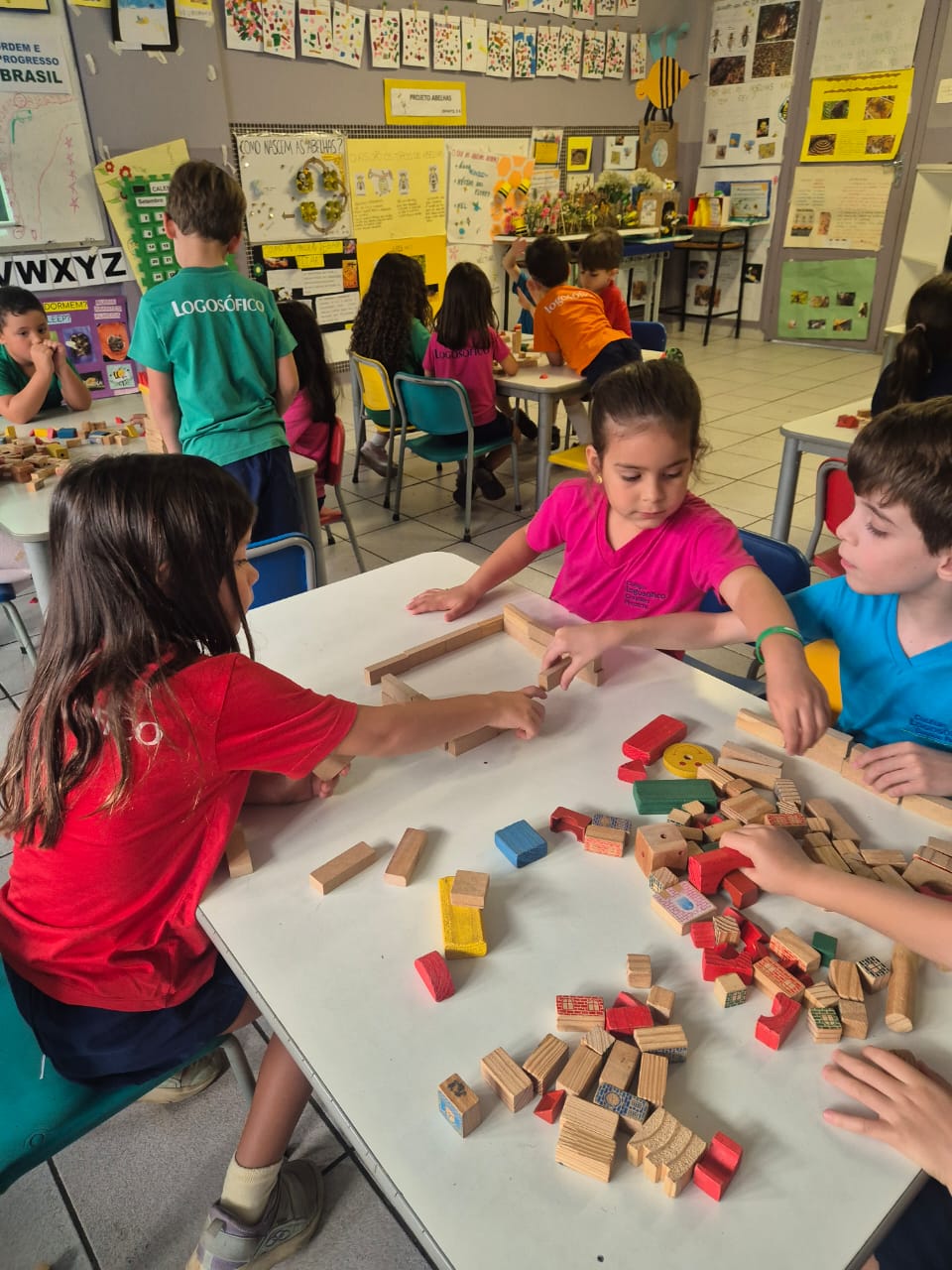 Como parte do Projeto Egito, as professoras Fernanda e Shirléa lançaram um desafio especial: cada mesa deveria construir uma pirâmide com blocos de madeira.