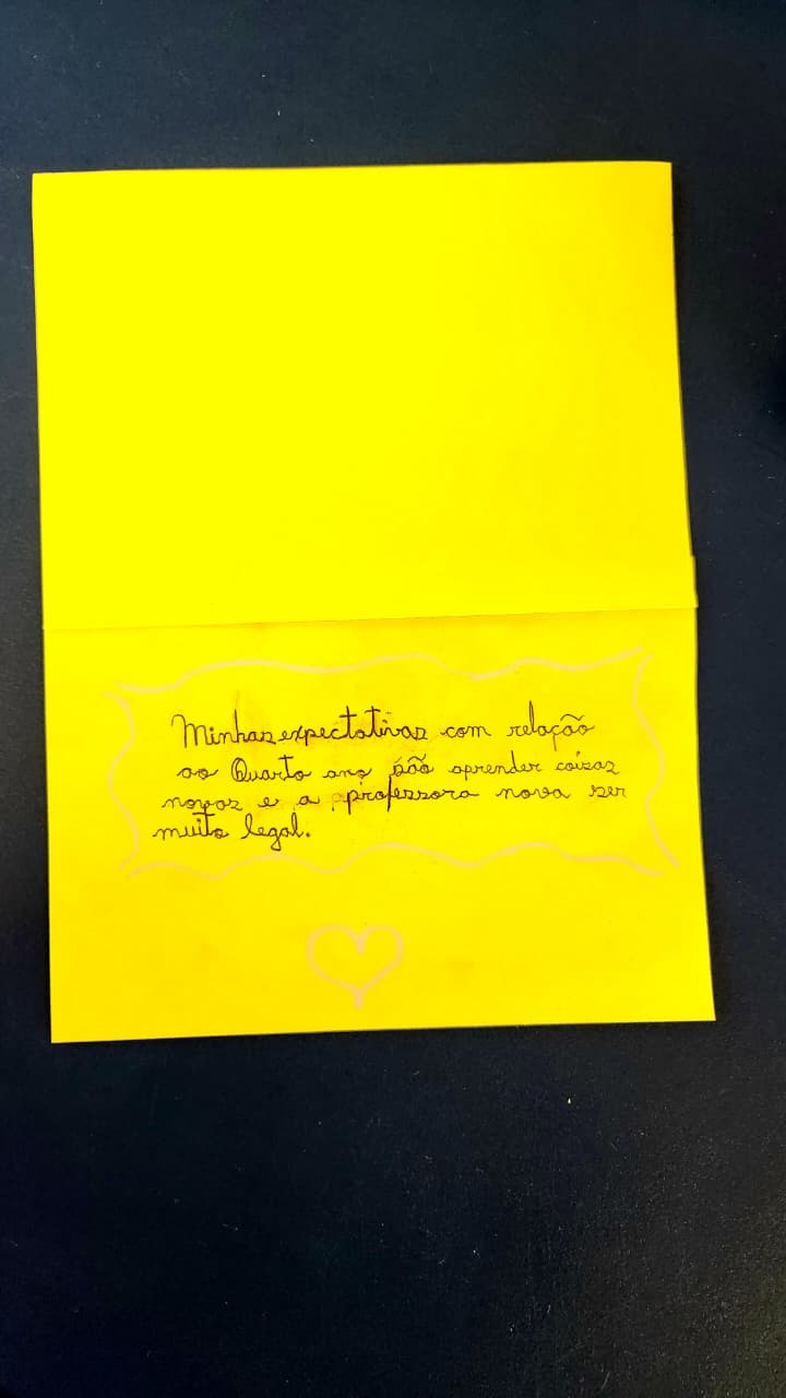 Os alunos do 4º Ano B participaram de uma roda de conversa especial para compartilhar suas expectativas para o novo ano letivo e para a convivência na turma. Em um momento de escuta e reflexão, escreveram sobre o que desejam aprender, os desafios que pretendem superar e como podem contribuir para um ambiente pautado no respeito, na amizade e na cooperação.