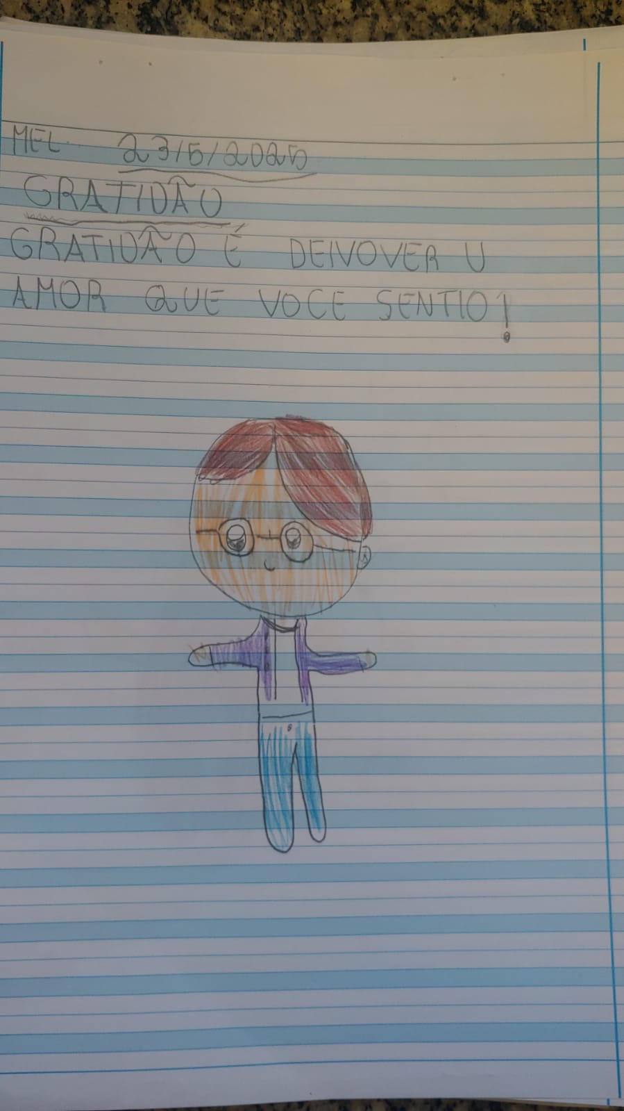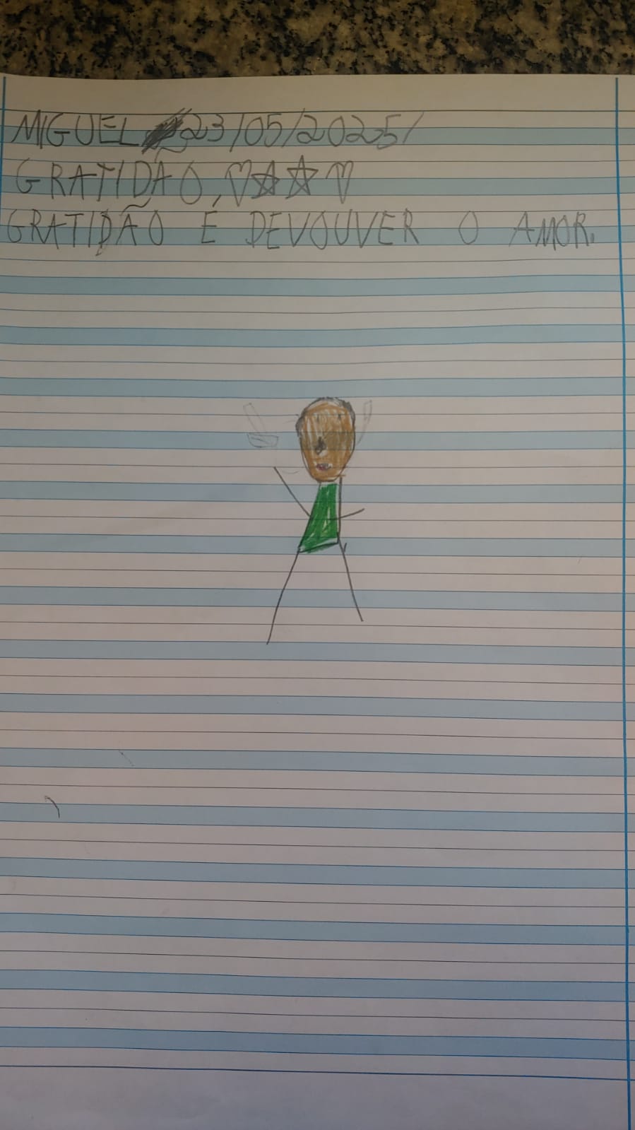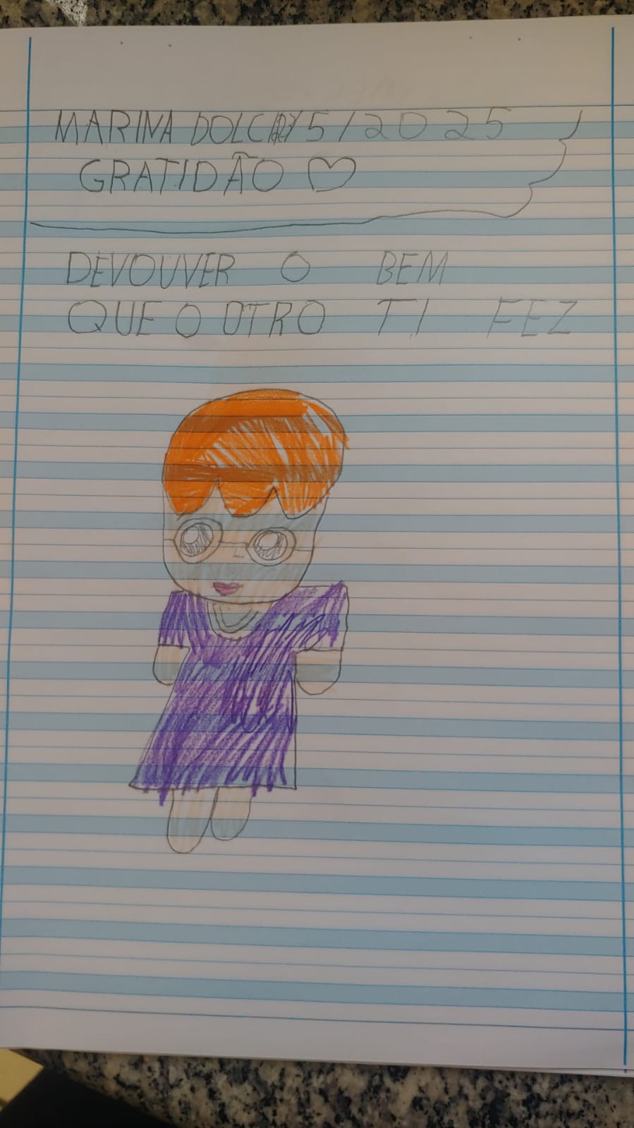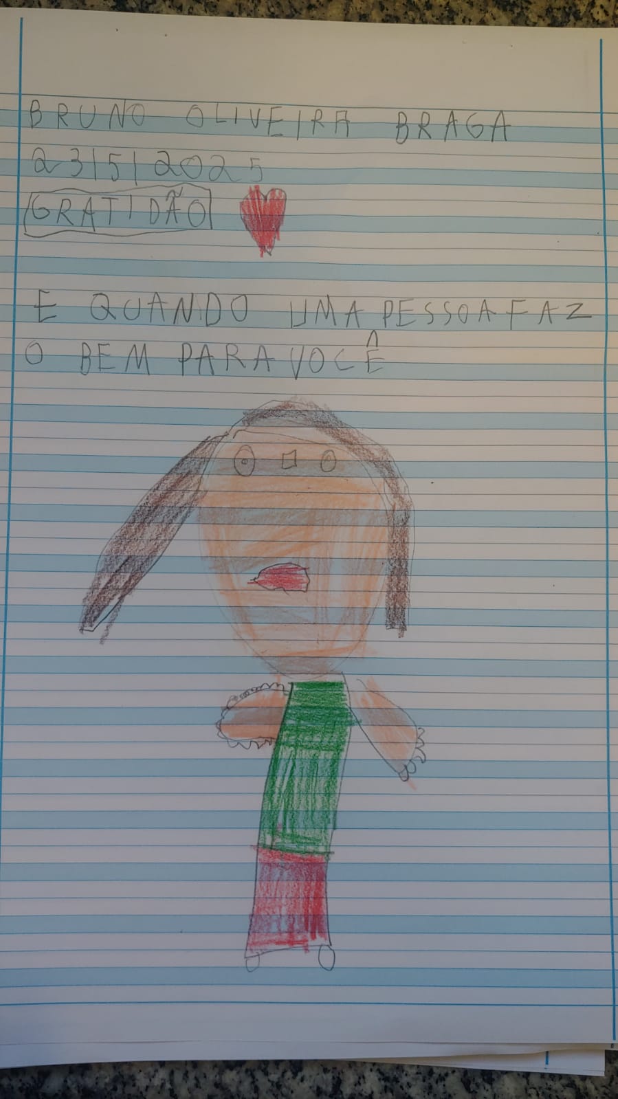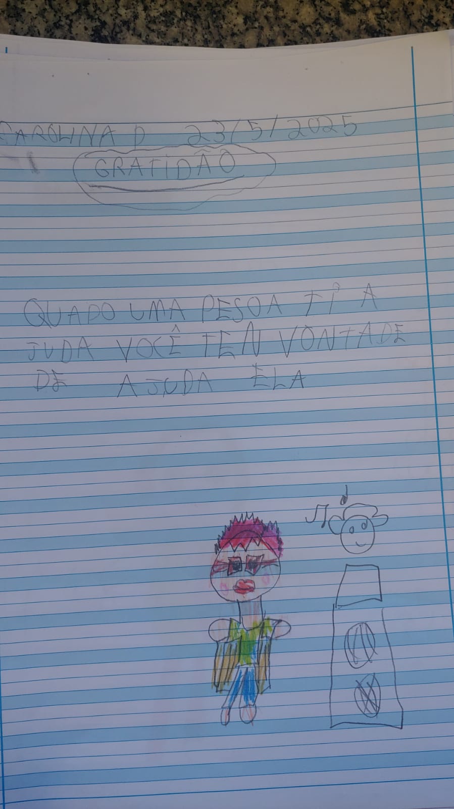 Após a conversa, os alunos registraram, com suas palavras e desenhos, o que compreenderam sobre esse valor tão importante. Foi uma aula de vida, que reforçou que a gratidão pode ser cultivada desde cedo — nas pequenas atitudes, nas relações com a família e nas amizades que construímos.