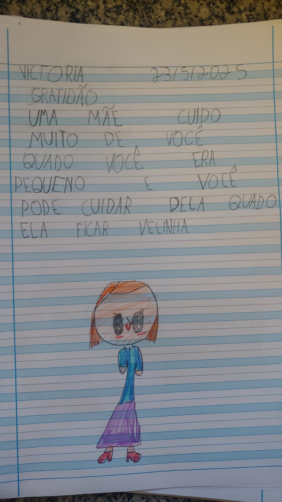 Com muita sensibilidade, Dona Regina compartilhou com as crianças sua experiência ao cuidar de sua mãe idosa e como o sentimento de gratidão foi essencial nesse processo. As crianças ouviram com atenção, fizeram perguntas curiosas e demonstraram grande interesse pela vivência.