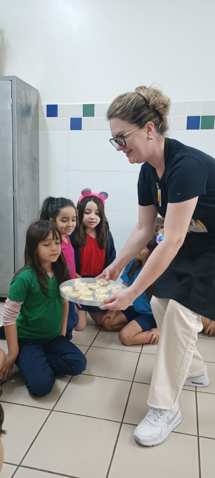 A manhã começou com a contação da história, feita por ela e sua filha Gabriela, trazendo aos alunos um relato real de sua infância. Em seguida, a turma foi para a cozinha experimental, onde aprendeu a preparar a deliciosa queijadinha, doce preferido de uma das personagens do livro.