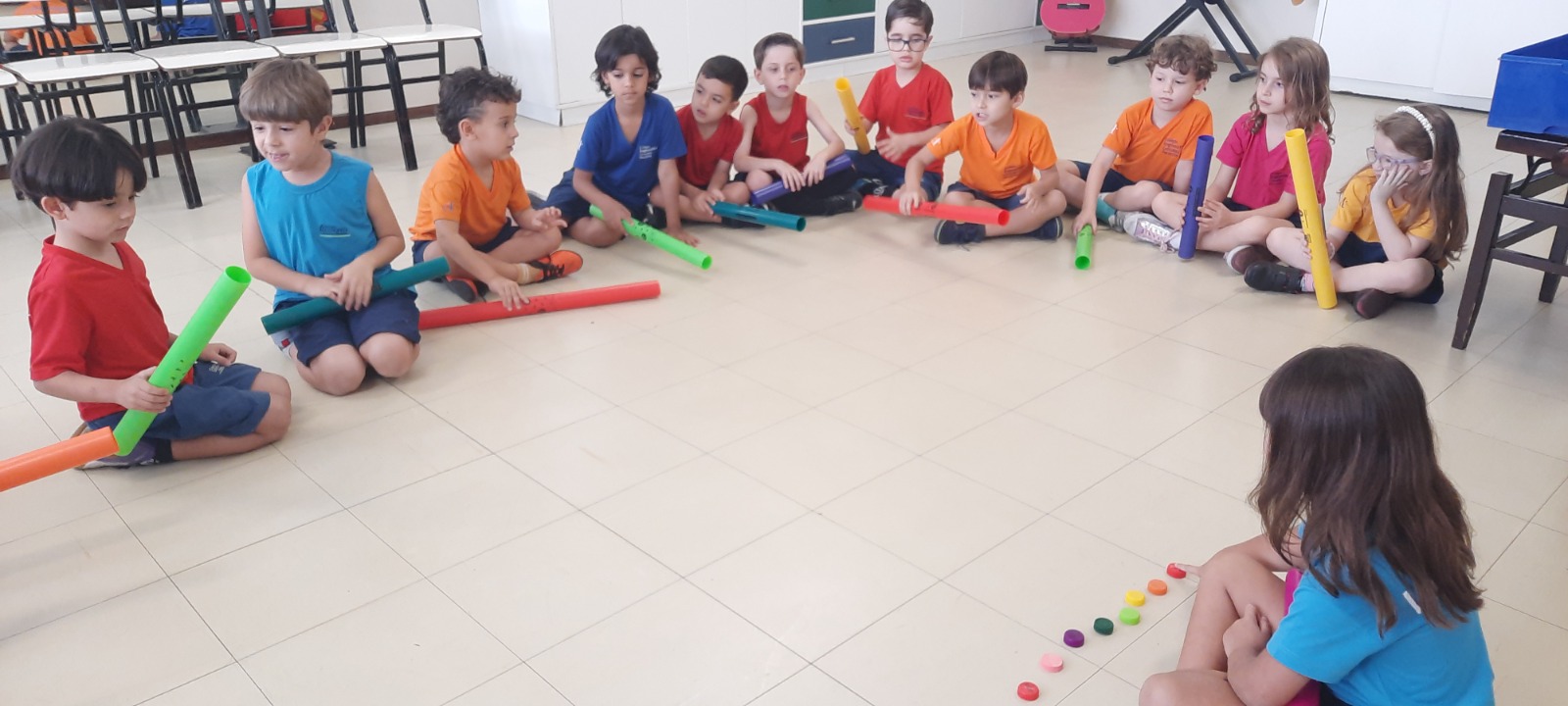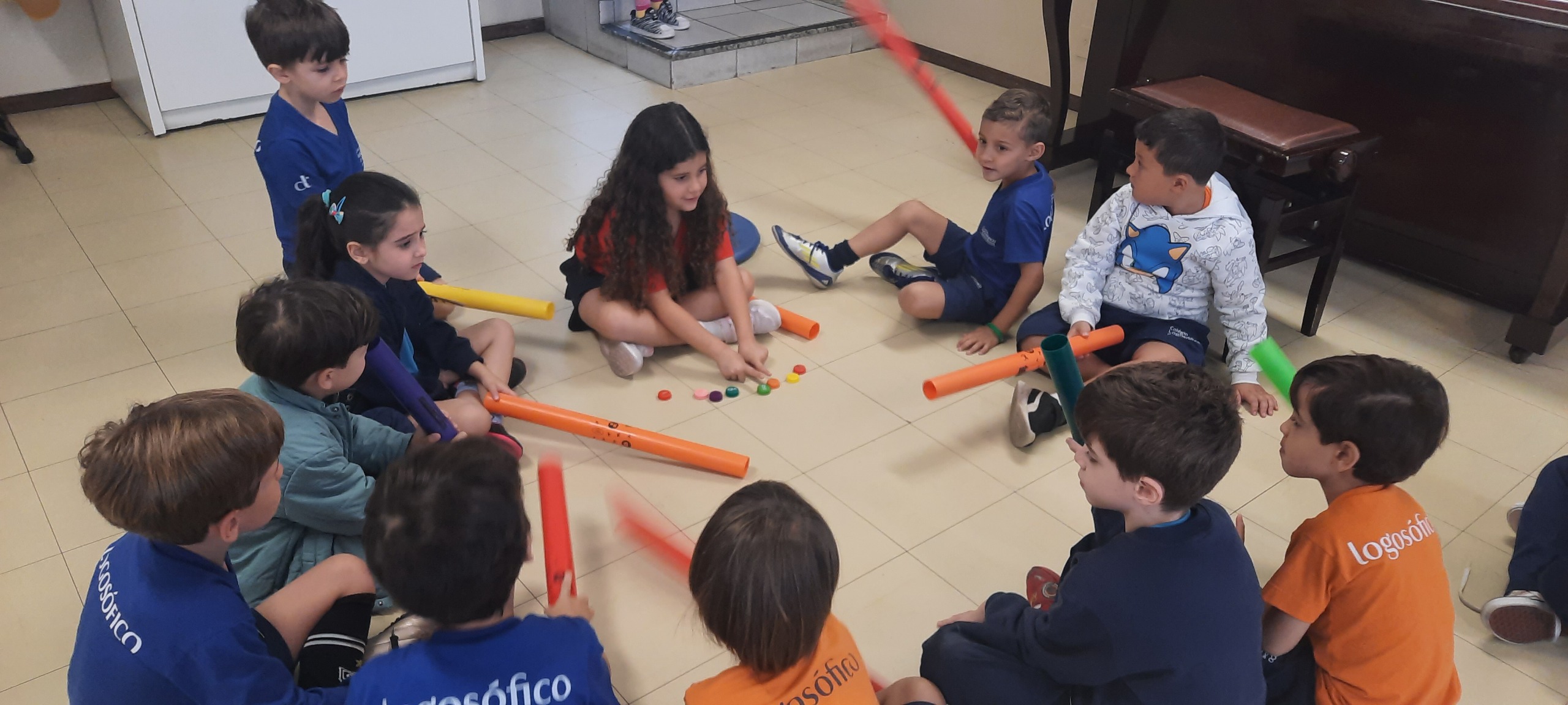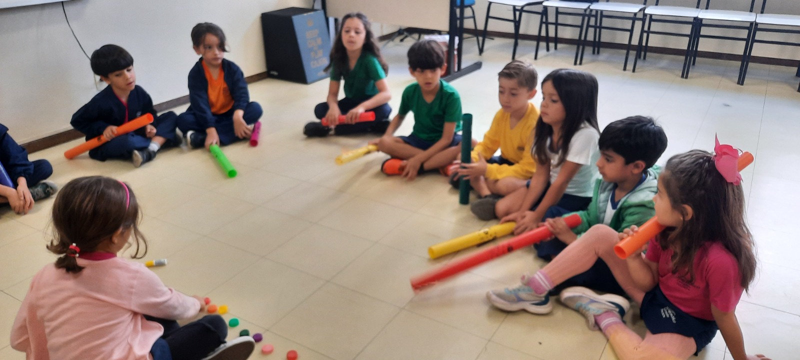 Nas aulas de Artes Musicais, os alunos do Ensino Infantil exploraram os tubos sonoros, cada um com uma cor do arco-íris e um som diferente, representando as notas da escala de dó.
