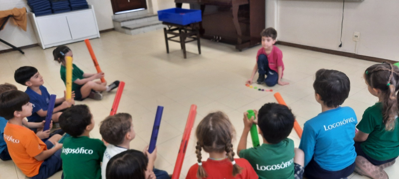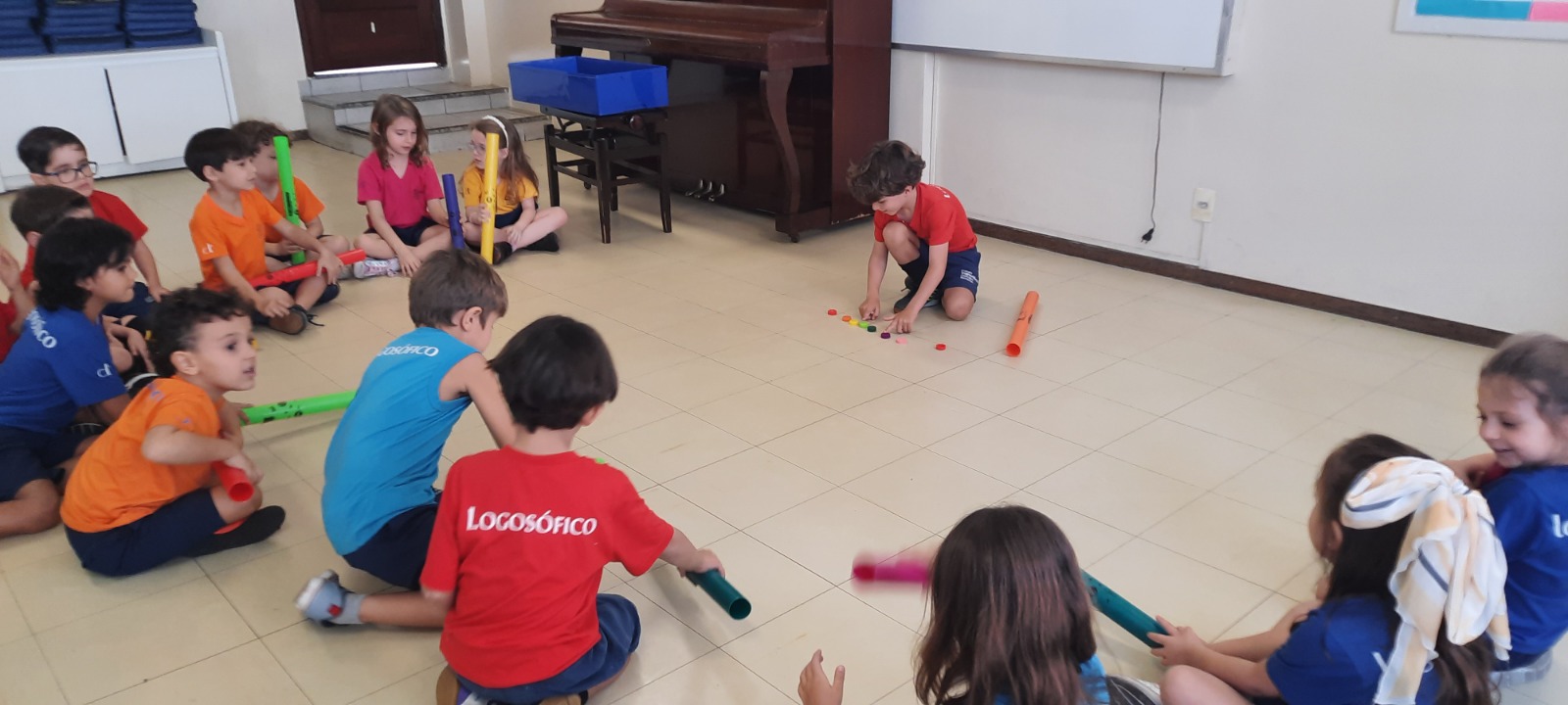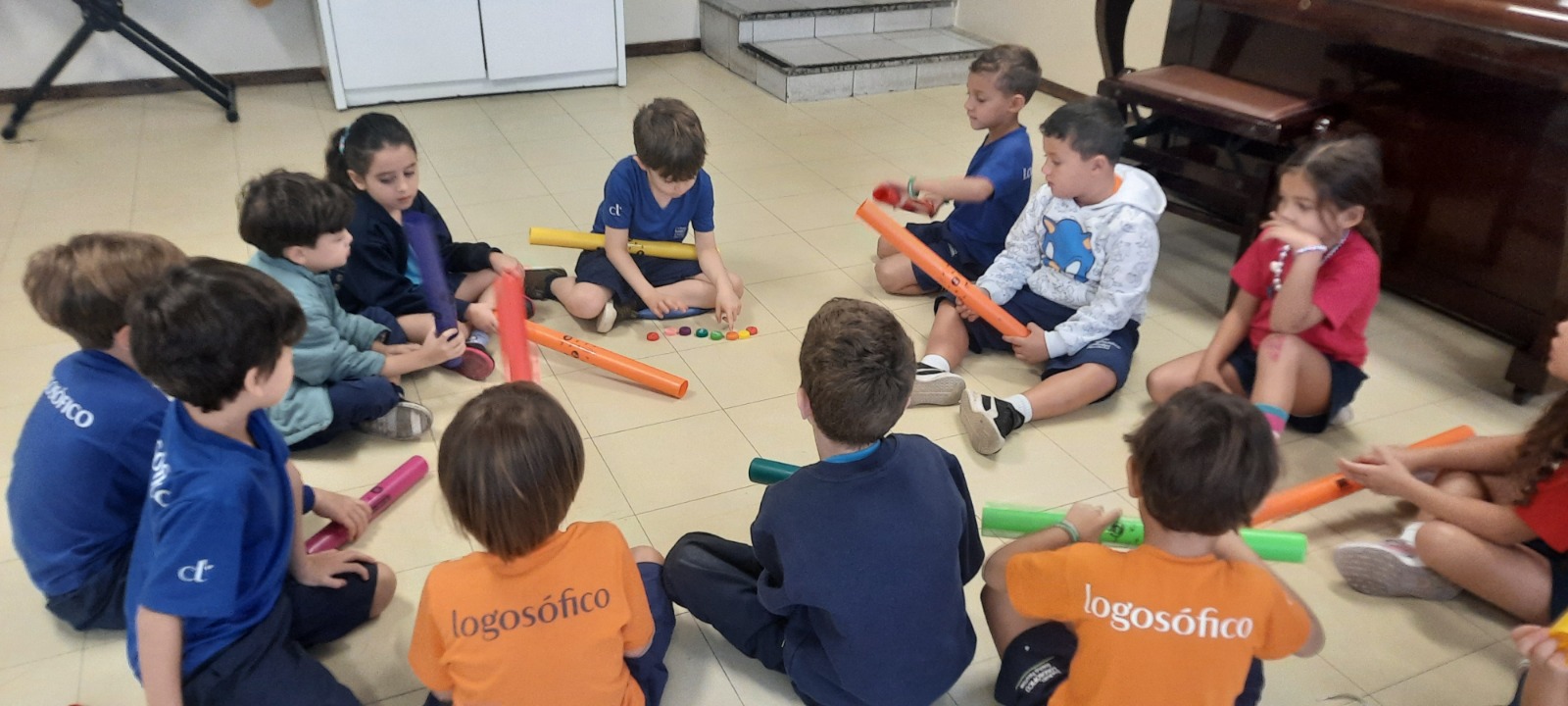 Nas aulas de Artes Musicais, os alunos do Ensino Infantil exploraram os tubos sonoros, cada um com uma cor do arco-íris e um som diferente, representando as notas da escala de dó.