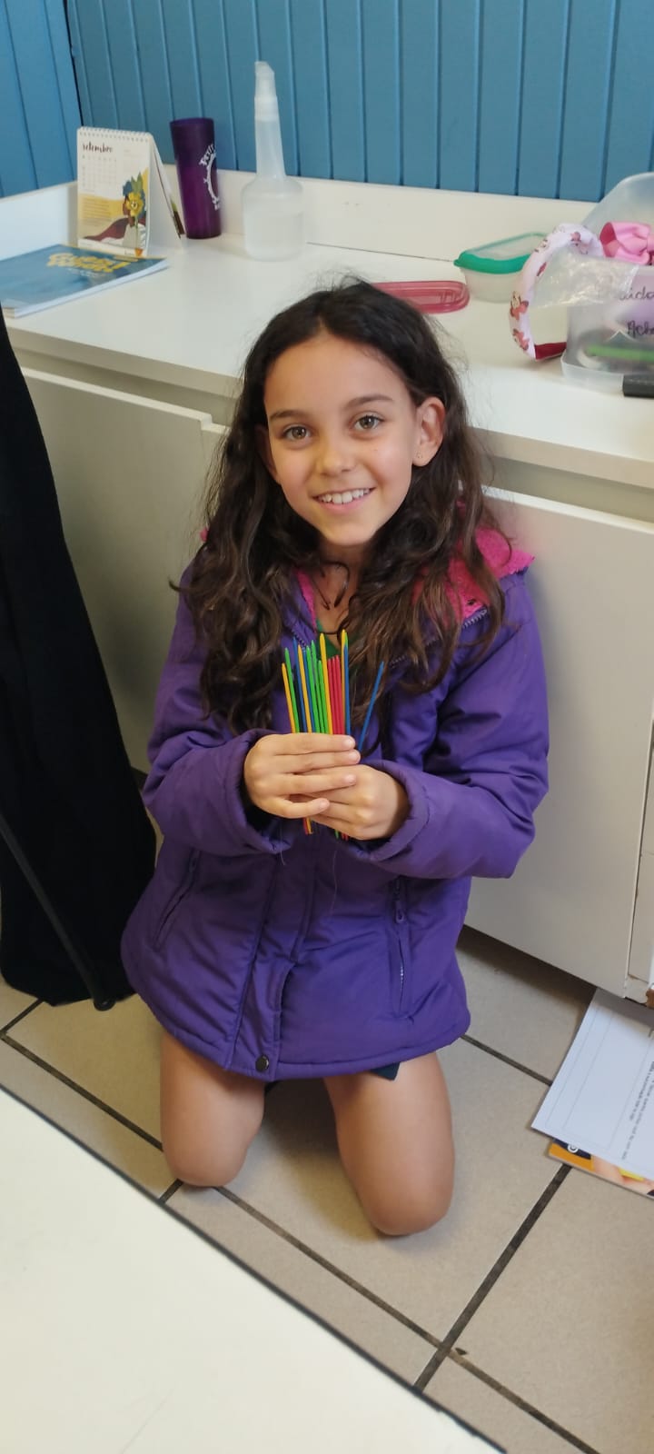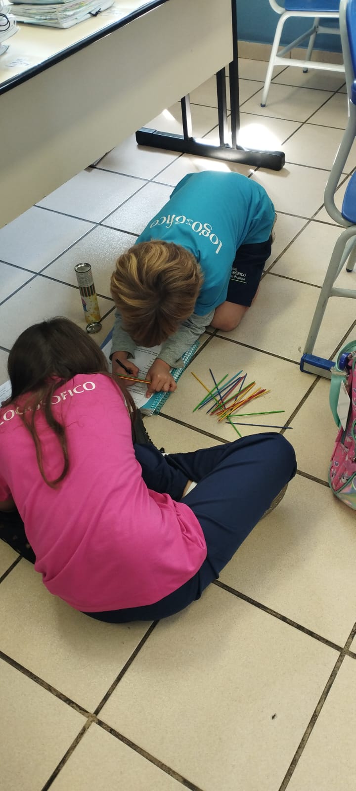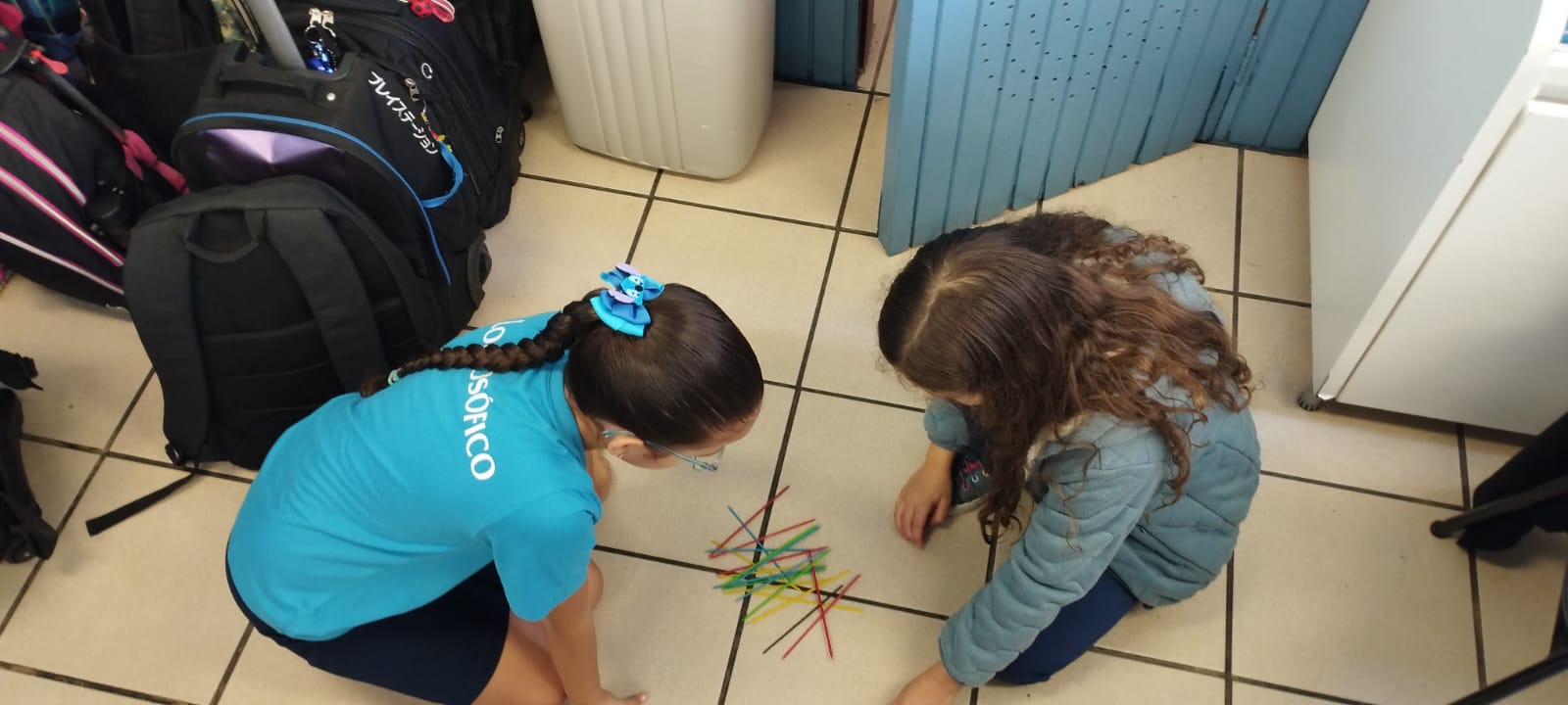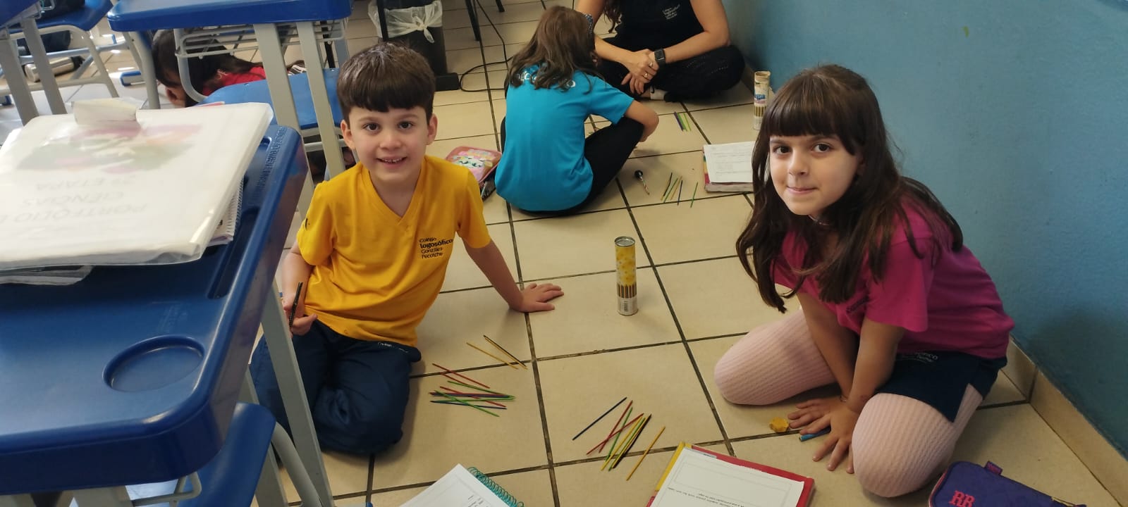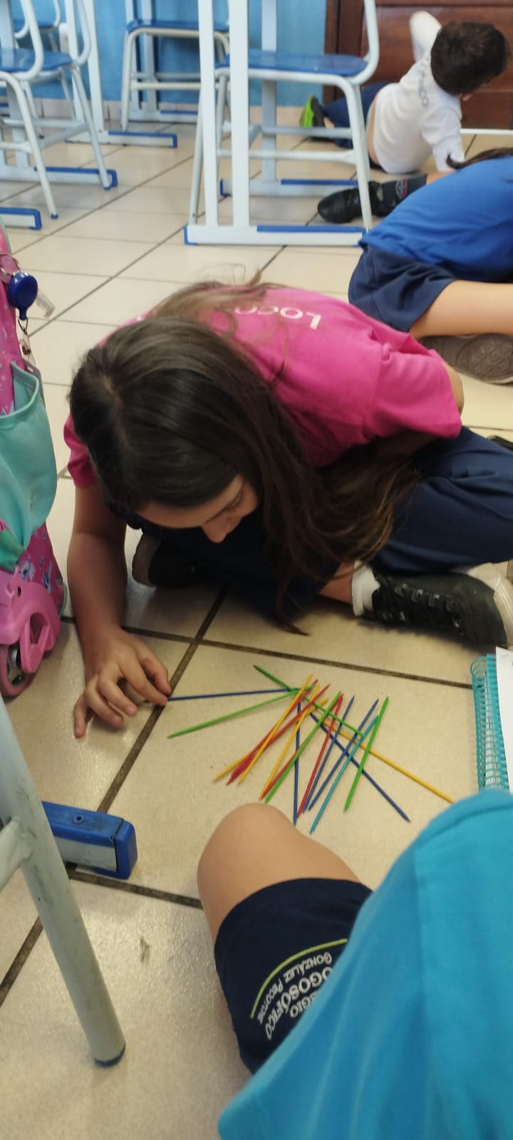 A professora propôs uma adaptação do clássico jogo “Pega Vareta”, em que cada vareta tinha uma pontuação específica. Em duplas, os alunos se divertiram retirando as varetas com cuidado e somando os pontos no quadro de ordens, revisando o conteúdo já estudado.