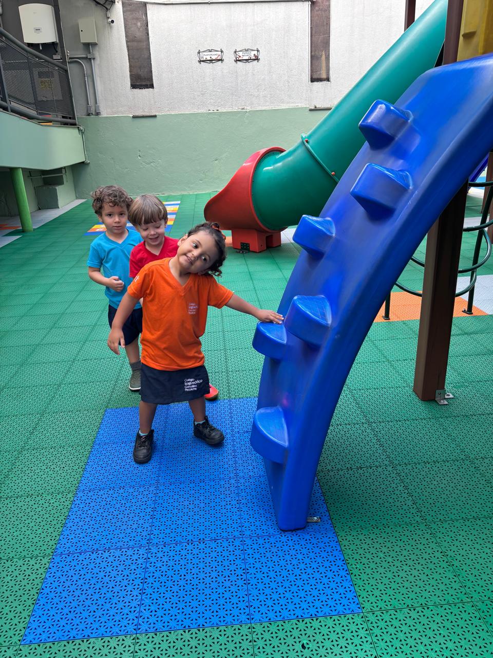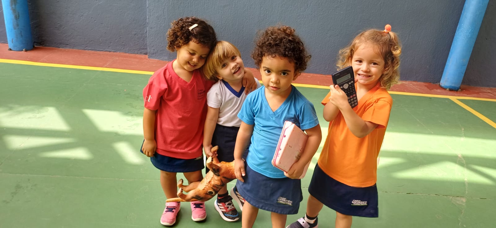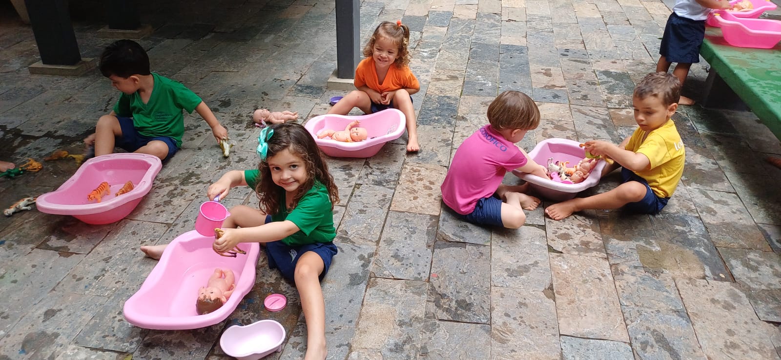 Teve bolinha de sabão, desenhos no azulejo, giz de cera molhado, parquinho, velotrol e até banho nas bonecas e bichinhos no Jardim Pedagógico!