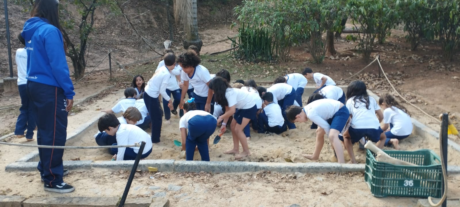 Um dos momentos mais esperados foi a escavação no tanque de areia. As crianças se transformaram em pequenos arqueólogos! Com pás nas mãos, procuraram por “fósseis” e se encantaram com a experiência de descobrir vestígios do passado. Uma aula viva de História!